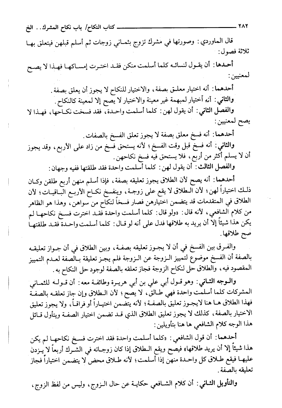 قال الماوردي: وصورتها في مشرك تزوج بثماني زَوْجَاتٍ ثُمَّ أَسْلَمَ قَبْلَهُنَّ فَيَتَعَلَّقُ بِهَا ثَلَاثَةُ فُصُولٍ:
