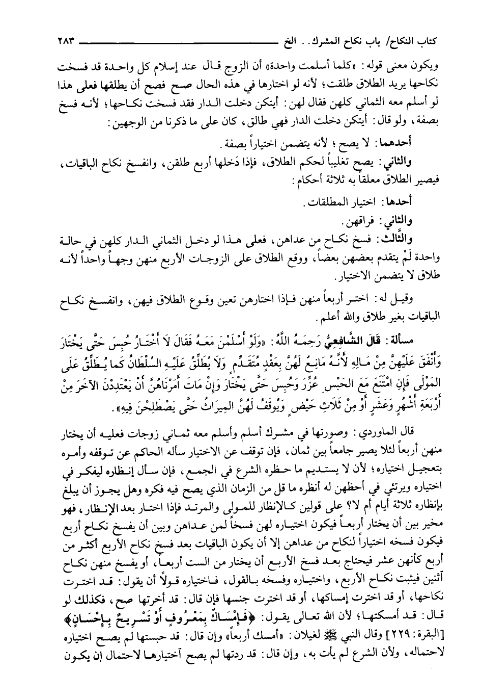 قَالَ الْمَاوَرْدِيُّ: وَصُورَتُهَا فِي مُشْرِكٍ أَسْلَمَ وَأَسْلَمَ مَعَهُ ثَمَانِي زَوْجَاتٍ فَعَلَيْهِ أَنْ يَخْتَارَ مِنْهُنَّ أَرْبَعًا لِئَلَّا يَصِيرَ جَامِعًا بَيْنَ ثَمَانٍ، فَإِنْ تَوَقَّفَ عَنِ الِاخْتِيَارِ سَأَلَهُ الْحَاكِمُ عَنْ تَوَقُّفِهِ وأمره بتعجيل اختياره؛ لأن لا يستديم ما حظره الشرع في الْجَمْعِ، فَإِنْ سَأَلَ إِنْظَارَهُ لِيُفَكِّرَ فِي اخْتِيَارِهِ وَيَرْتَئِيَ فِي أَحَظِّهِنَّ لَهُ أَنْظَرَهُ مَا قَلَّ مَنِ الزَّمَانِ الَّذِي يَصِحُّ فِيهِ فِكْرُهُ وَهَلْ يَجُوزُ أَنْ يَبْلُغَ بِإِنْظَارِهِ ثَلَاثَةَ أَيَّامٍ أَمْ لَا؟ عَلَى قَوْلَيْنِ كَالْإِنْظَارِ لِلْمُولِي وَالْمُرْتَدِّ فَإِذَا اخْتَارَ بَعْدَ الْإِنْظَارِ، فَهُوَ مُخَيَّرٌ بَيْنَ أَنْ يختار أربعاً فيكون اختياره لهن فسخاً لمن عَدَاهُنَّ وَبَيْنَ أَنْ يَفْسَخَ نِكَاحَ أَرْبَعٍ فَيَكُونُ فَسْخُهُ اخْتِيَارًا لِنِكَاحِ مَنْ عَدَاهُنَّ إِلَّا أَنْ يَكُونَ الْبَاقِيَاتُ بَعْدَ فَسْخِ نِكَاحِ الْأَرْبَعِ أَكْثَرَ مِنْ أَرْبَعٍ كَأَنَّهُنَّ عَشْرٌ فَيَحْتَاجُ بَعْدَ فَسْخِ الْأَرْبَعِ أَنْ يَخْتَارَ مِنَ السِّتِّ أَرْبَعًا، أَوْ يفسخ منهن نكاح اثنين فَيَثْبُتُ نِكَاحُ الْأَرْبَعِ، وَاخْتِيَارُهُ وَفَسْخُهُ بِالْقَوْلِ، فَاخْتِيَارُهُ قَوْلًا أَنْ يَقُولَ: قَدِ اخْتَرْتُ نِكَاحَهَا، أَوْ قد اخترت إمساكها، أو قد اخترت جنسها فإن قال: قد أخرتها صَحَّ، فَكَذَلِكَ لَوْ قَالَ: قَدْ أَمْسَكْتُهَا؛ لِأَنَّ اللَّهَ تَعَالَى يَقُولُ: {فَإِمْسَاكٌ بِمَعْرُوفٍ أَوْ تَسْرِيحٌ بِإِحْسَانٍ} (البقرة: 229) وَقَالَ النَّبِيُّ - صَلَّى اللَّهُ عَلَيْهِ وَسَلَّم َ - لِغَيْلَانَ: " أَمْسِكْ أَرْبَعًا " وَإِنْ قَالَ: قَدْ حَبَسْتُهَا لم يصح اختياره لِاحْتِمَالِهِ، وَلِأَنَّ الشَّرْعَ لَمْ يَأْتِ بِهِ، وَإِنْ قال: قد ردتها لَمْ يَصِحَّ اخْتِيَارُهَا لِاحْتِمَالِ أَنْ يَكُونَ