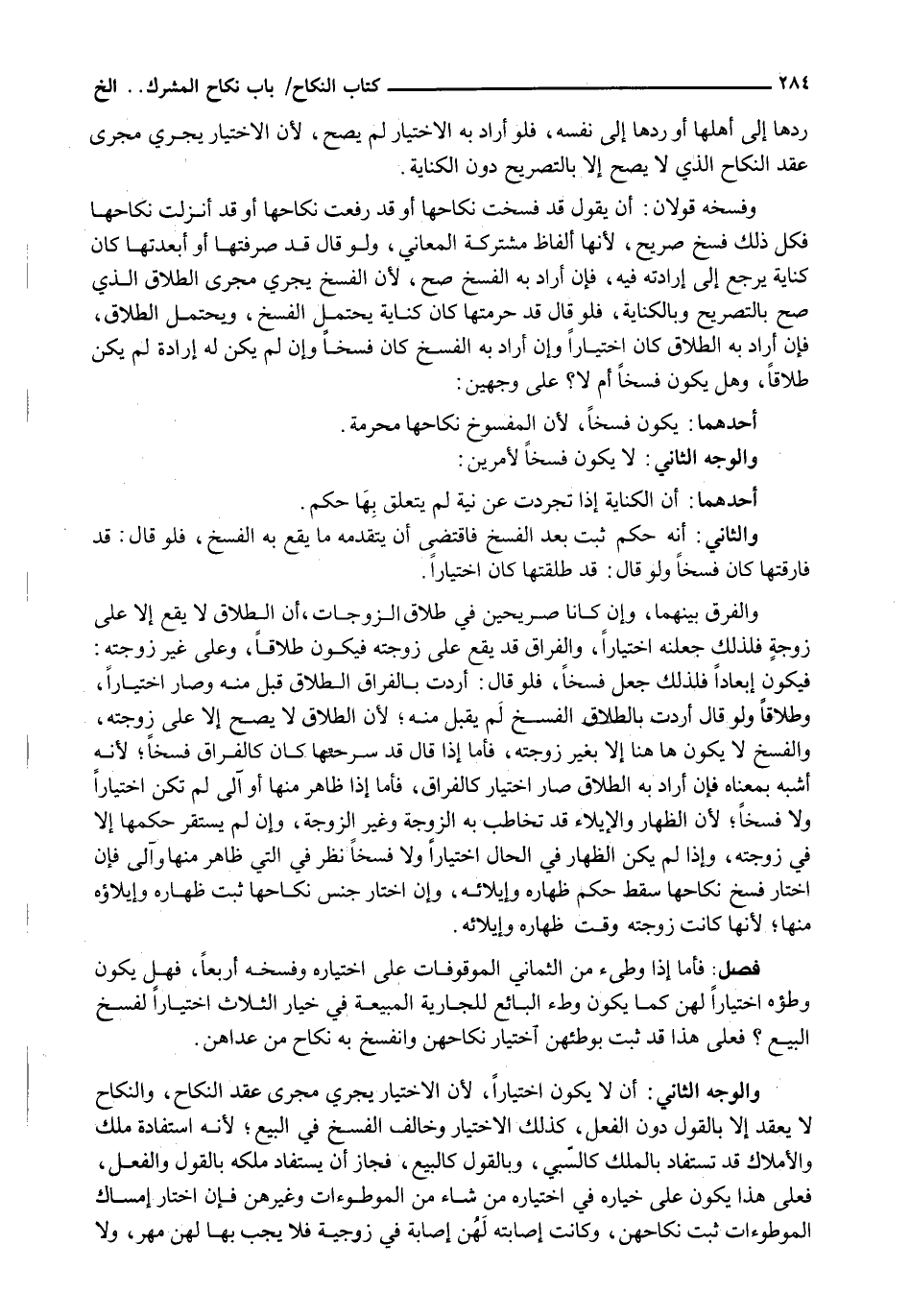 وفسخه قولان: أَنْ يَقُولَ قَدْ فَسَخْتُ نِكَاحَهَا أَوْ قَدْ رَفَعْتُ نِكَاحَهَا أَوْ قَدْ أَنْزَلْتُ نِكَاحَهَا فَكُلُّ ذَلِكَ فَسْخٌ صَرِيحٌ، لِأَنَّهَا أَلْفَاظٌ مُشْتَرَكَةُ الْمَعَانِي، وَلَوْ قَالَ قَدْ صَرَفْتُهَا أَوْ أَبْعَدْتُهَا كَانَ كِنَايَةً يَرْجِعُ إِلَى إِرَادَتِهِ فِيهِ، فَإِنْ أَرَادَ بِهِ الْفَسْخَ صَحَّ، لِأَنَّ الْفَسْخَ يَجْرِي مَجْرَى الطلاق الذي صح بالتصريح وَبِالْكِنَايَةِ، فَلَوْ قَالَ قَدْ حَرَّمْتُهَا كَانَ كِنَايَةً يَحْتَمِلُ الْفَسْخَ، وَيَحْتَمِلُ الطَّلَاقَ، فَإِنْ أَرَادَ بِهِ الطَّلَاقَ كَانَ اخْتِيَارًا وَإِنْ أَرَادَ بِهِ الْفَسْخَ كَانَ فَسْخًا وَإِنْ لَمْ يَكُنْ لَهُ إِرَادَةٌ لَمْ يَكُنْ طَلَاقًا، وَهَلْ يَكُونُ فَسْخًا أَمْ لَا؟ عَلَى وَجْهَيْنِ: