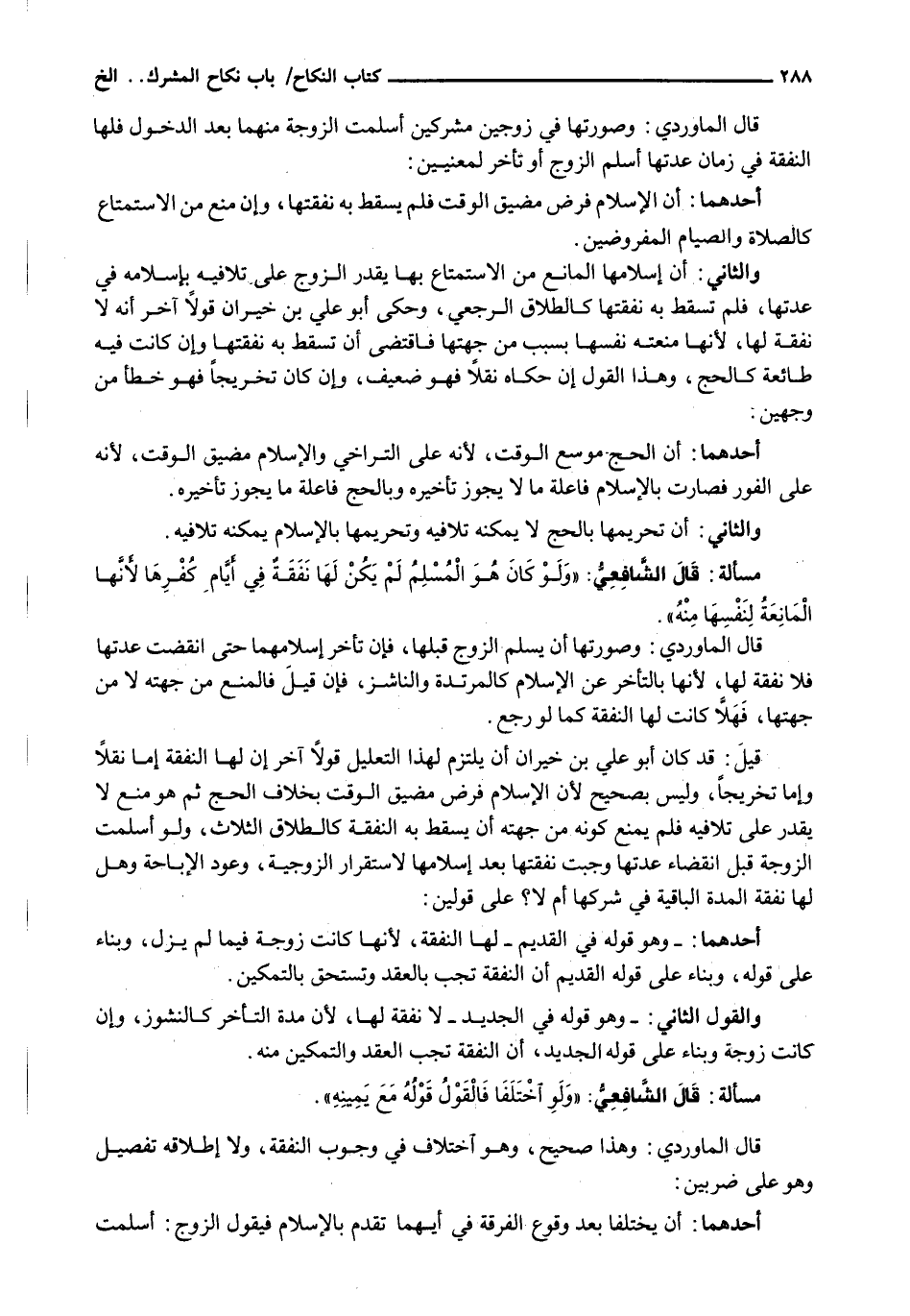 قَالَ الْمَاوَرْدِيُّ: وَصُورَتُهَا فِي زَوْجَيْنِ مُشْرِكَيْنِ أَسْلَمَتِ الزَّوْجَةُ مِنْهُمَا بَعْدَ الدُّخُولِ فَلَهَا النَّفَقَةُ فِي زَمَانِ عِدَّتِهَا أَسْلَمَ الزَّوْجُ أَوْ تَأَخَّرَ لِمَعْنَيَيْنِ: