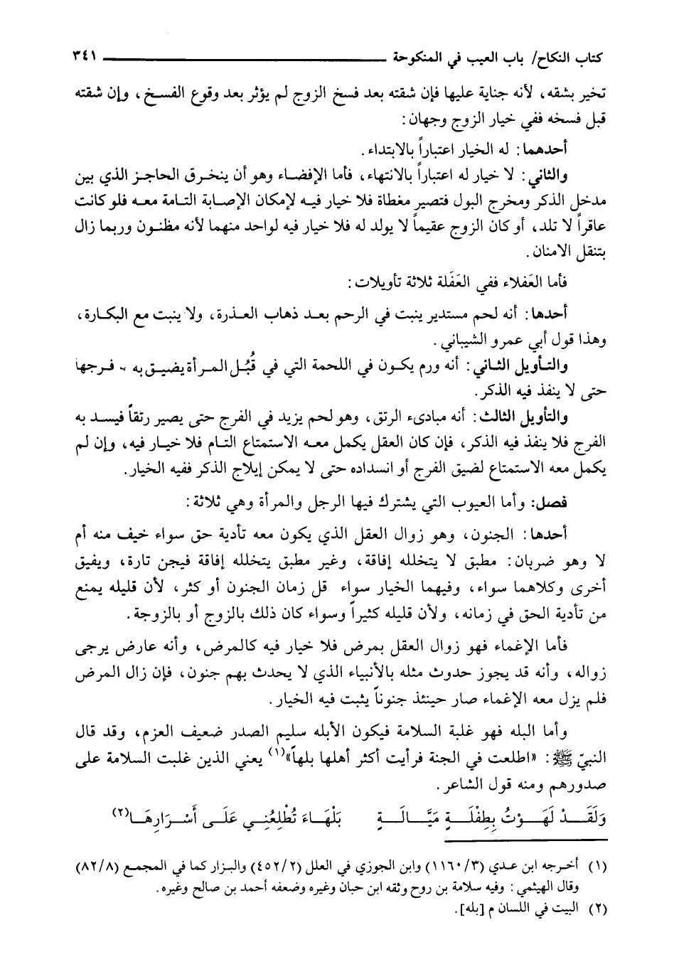 وَالتَّأْوِيلُ الثَّالِثُ: إِنَّهُ مَبَادِئُ الرَّتْقِ، وَهُوَ لَحْمٌ يَزِيدُ فِي الْفَرْجِ حَتَّى يَصِيرَ رتقاً فيسد بِهِ الْفَرْجُ فَلَا يَنْفُذُ فِيهِ الذَّكَرُ، فَإِنْ كان العقل يُكْمِلُ مَعَهُ الِاسْتِمْتَاعَ التَّامَّ فَلَا خِيَارَ فِيهِ، وَإِنْ لَمْ يُكْمِلْ مَعَهُ الِاسْتِمْتَاعَ لِضِيقِ الْفَرْجِ أَوِ انْسِدَادِهِ حَتَّى لَا يُمْكِنَ إِيلَاجُ الذَّكَرِ فَفِيهِ الْخِيَارُ.