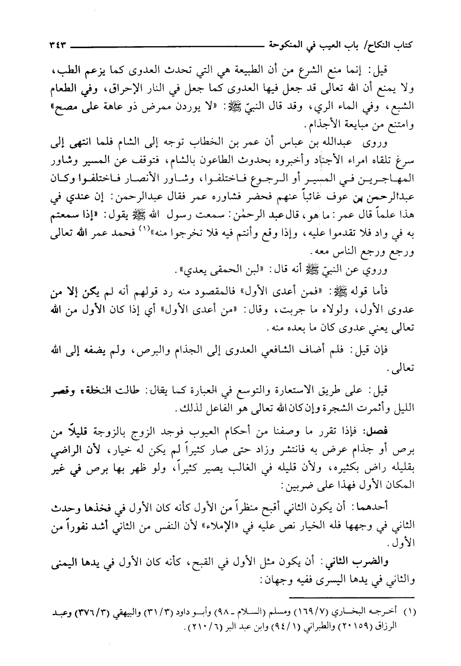 قِيلَ: إِنَّمَا مَنْعُ الشَّرْعِ مِنْ أَنَّ الطَّبِيعَةَ هِيَ الَّتِي تُحْدِثُ الْعَدْوَى كَمَا يَزْعُمُ الطِّبُّ، ولا يمنع أن الله تَعَالَى قَدْ جَعَلَ فِيهَا الْعَدْوَى كَمَا جَعَلَ فِي النَّارِ الْإِحْرَاقَ، وَفِي الطَّعَامِ الشِّبَعَ، وَفِي الْمَاءِ الرِّيَّ، وَقَدْ قَالَ النَّبِيُّ - صَلَّى اللَّهُ عَلَيْهِ وَسَلَّم َ -: " لا يوردن ممرض ذُو عَاهَةٍ عَلَى مُصِحٍّ " وَامْتَنَعَ مِنْ مُبَايَعَةِ الأجذام.