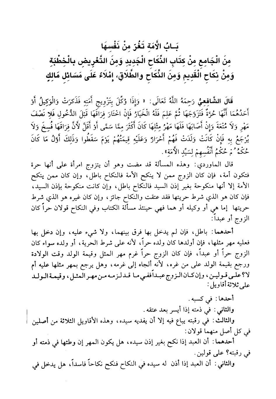 باب الأمة تغر من نفسها من الجامع من كتاب النكاح الجديد ومن التعريض بالخطبة ومن نكاح القديم ومن النكاح والطلاق، إملاءً على مسائل مالكٍ