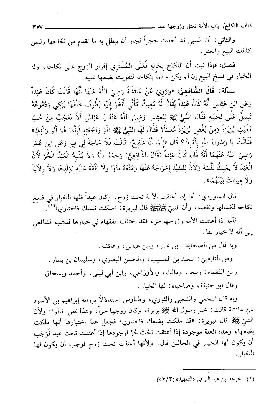 قال الماوردي: أما إذا أعتقت الْأَمَةُ تَحْتَ زَوْجٍ، وَكَانَ عَبْدًا فَلَهَا الْخِيَارُ فِي فَسْخِ نِكَاحِهِ لِكَمَالِهَا وَنَقْصِهِ، وَأَنَّ النَّبِيَّ - صَلَّى اللَّهُ عَلَيْهِ وَسَلَّم َ - قَالَ لِبَرِيرَةَ: " مَلَكْتِ نَفْسَكِ فَاخْتَارِي ".