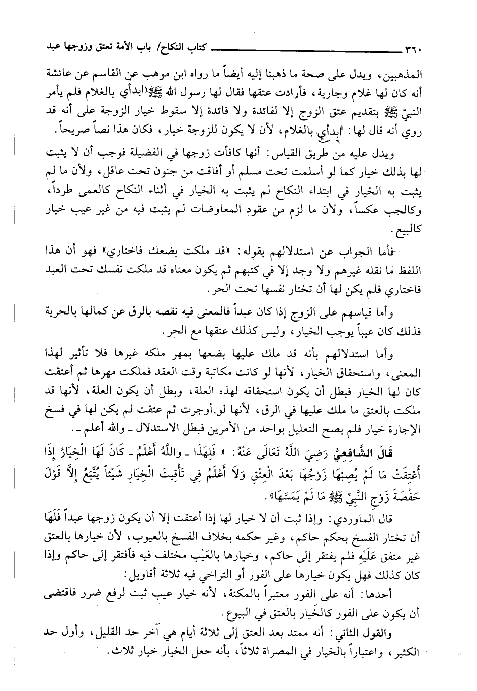 قال الشافعي رضي الله تعالى عنه: " فَلِهَذَا - وَاللَّهُ أَعْلَمُ - كَانَ لَهَا الْخِيَارُ إِذَا أعتقت ما لم يصبها زوجها بَعْدَ الْعِتْقِ وَلَا أَعْلَمُ فِي تَأَقْيِتِ الْخِيَارِ شَيْئًا يُتَّبَعُ إِلَّا قَوْلَ حَفْصَةَ زَوْجِ النَّبِيِّ - صَلَّى اللَّهُ عَلَيْهِ وَسَلَّم َ - مَا لَمْ يَمَسَّهَا ".