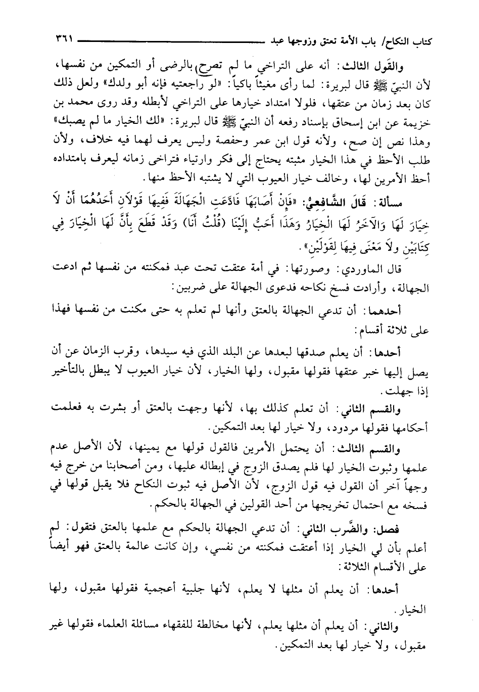 وَالْقِسْمُ الثَّالِثُ: أَنْ يَحْتَمِلَ الْأَمْرَيْنِ فَالْقَوْلُ قَوْلُهَا مَعَ يَمِينِهَا، لِأَنَّ الْأَصْلَ عَدَمُ عِلْمِهَا وثبوت الخيار لها فَلَمْ يُصَدَّقِ الزَّوْجُ فِي إِبْطَالِهِ عَلَيْهَا، وَمِنْ أَصْحَابِنَا مَنْ خَرَّجَ فِيهِ وَجْهًا آخَرَ أَنَّ الْقَوْلَ فِيهِ قَوْلُ الزَّوْجِ، لِأَنَّ الْأَصْلَ فِيهِ ثُبُوتُ النِّكَاحِ فَلَا يَقْبَلُ قَوْلَهَا فِي فَسْخِهِ مع احتمال تخريجها مِنْ أَحَدِ الْقَوْلَيْنِ فِي الْجَهَالَةِ بِالْحُكْمِ.
