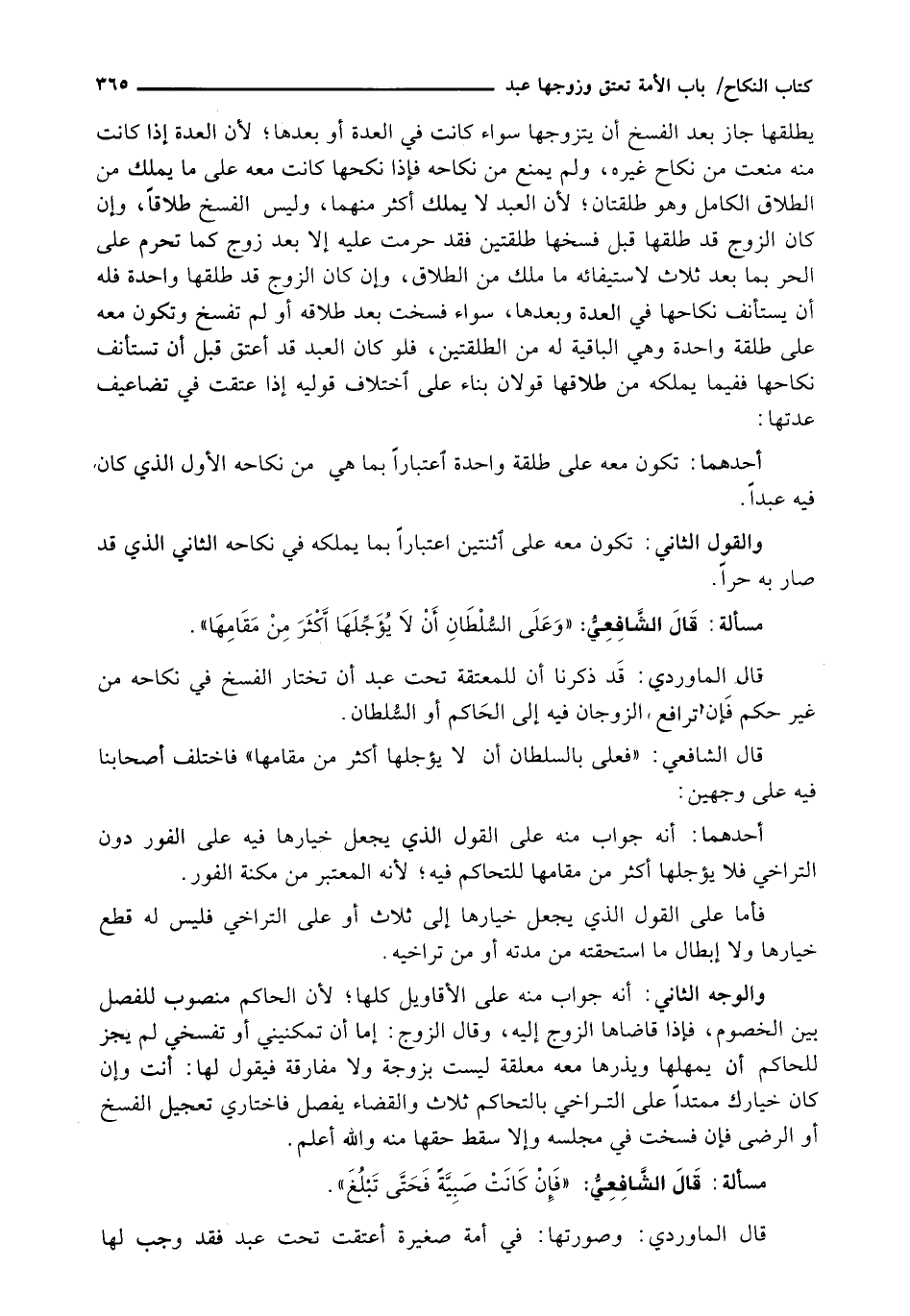 قَالَ الْمَاوَرْدِيُّ: قَدْ ذَكَرْنَا أَنَّ لِلْمُعْتَقَةِ تحت عبد أن تختار الفسخ في نِكَاحِهِ مِنْ غَيْرِ حَكَمٍ فَإِنْ تَرَافَعَ الزَّوْجَانِ فِيهِ إِلَى الْحَاكِمِ أَوِ السُّلْطَانِ.