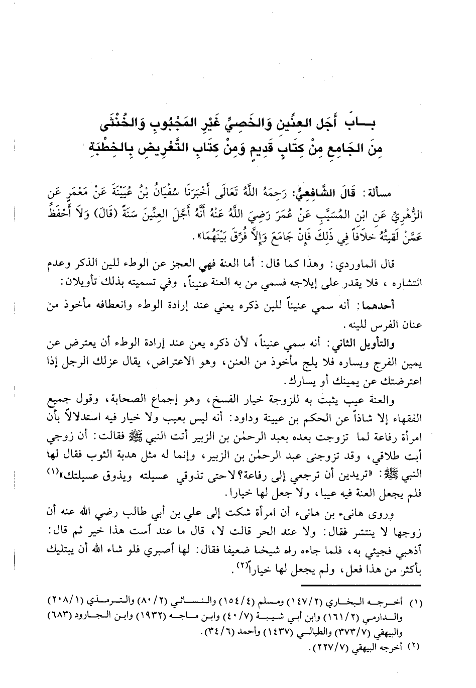 وَالْعُنَّةُ عَيْبٌ يَثْبُتُ بِهِ لِلزَّوْجَةِ خِيَارُ الْفَسْخِ، وَهُوَ إِجْمَاعُ الصَّحَابَةِ، وَقَوْلُ جَمِيعِ الْفُقَهَاءِ إِلَّا شاذاً عن الحكم عن عيينة وَدَاوُدَ، إِنَّهُ لَيْسَ بِعَيْبٍ وَلَا خِيَارَ فِيهِ اسْتِدْلَالًا بِأَنَّ امْرَأَةَ رِفَاعَةَ لَمَّا تَزَوَّجَتْ بَعْدَهُ بِعَبْدِ الرَّحْمَنِ بْنِ الزُّبَيْرِ أَتَتِ النَّبِيَّ - صَلَّى اللَّهُ عَلَيْهِ وَسَلَّم َ - فقالت: أن زوجي أبت طلاقي، وقد تزوجني عبد الرحمن بن الزبير، وإنما له مِثْلُ هُدْبَةِ الثَّوْبِ فَقَالَ لَهَا النَّبِيُّ - صَلَّى اللَّهُ عَلَيْهِ وَسَلَّم َ -: " تُرِيدِينَ أَنْ تَرْجِعِي إِلَى رِفَاعَةَ؟ لَا حَتَّى تَذُوقِي عُسَيْلَتَهُ وَيَذُوقُ عُسَيْلَتَكِ " فَلَمْ يَجْعَلِ الْعُنَّةَ فِيهِ عَيْبًا، وَلَا جَعَلَ لَهَا خِيَارًا.