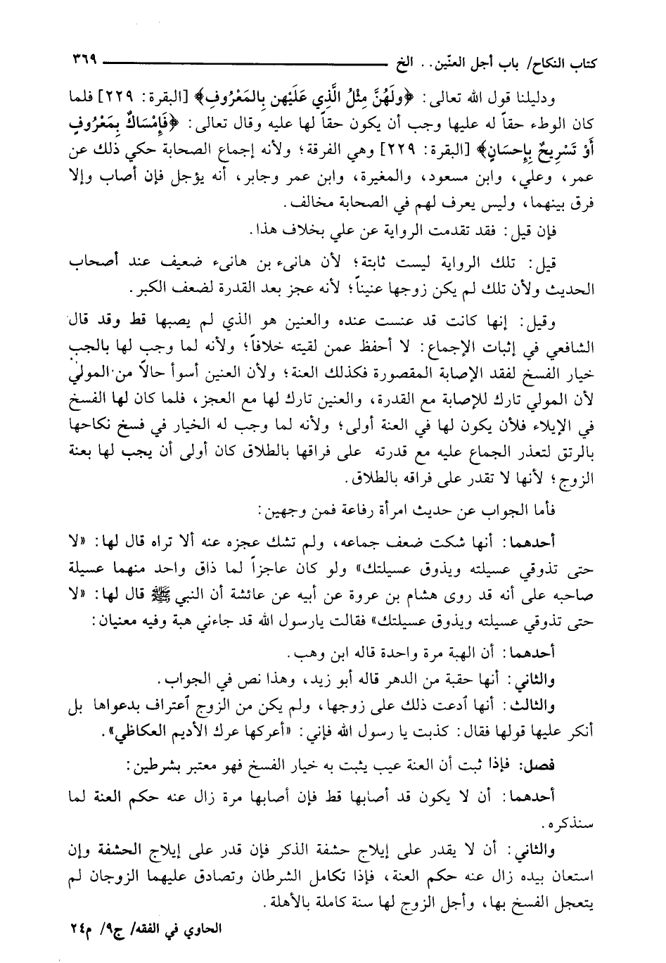 وَقِيلَ: إِنَّهَا كَانَتْ قَدْ عَنَّسَتْ عِنْدَهُ وَالْعِنِّينُ هُوَ الَّذِي لَمْ يُصِبْهَا قَطُّ وَقَدْ قال الشافعي في إثبات الإجماع: لا أحفظ عمن لَقِيتُهُ خِلَافًا؛ وَلِأَنَّهُ لَمَّا وَجَبَ لَهَا بِالْجَبِّ خيار الفسخ لفقد الإصابة المقصورة فكذلك العنة؛ ولأن الْعِنِّينَ أَسْوَأُ حَالًا مِنَ الْمُولِي لِأَنَّ الْمُولِيَ تَارِكٌ لِلْإِصَابَةِ مَعَ الْقُدْرَةِ، وَالْعِنِّينَ تَارِكٌ لَهَا مَعَ الْعَجْزِ، فَلَمَّا كَانَ لَهَا الْفَسْخُ فِي الْإِيلَاءِ فَلَأَنْ يَكُونَ لَهَا فِي الْعُنَّةِ أَوْلَى؛ وَلِأَنَّهُ لَمَّا وَجَبَ لَهُ الْخِيَارُ فِي فَسْخِ نِكَاحِهَا بِالرَّتْقِ لِتَعَذُّرِ الْجِمَاعِ عَلَيْهِ مَعَ قُدْرَتِهِ عَلَى فِرَاقِهَا بِالطَّلَاقِ كَانَ أَوْلَى أَنْ يَجِبَ لَهَا بِعُنَّةِ الزَّوْجِ؛ لِأَنَّهَا لَا تَقْدِرُ عَلَى فِرَاقِهِ بِالطَّلَاقِ.