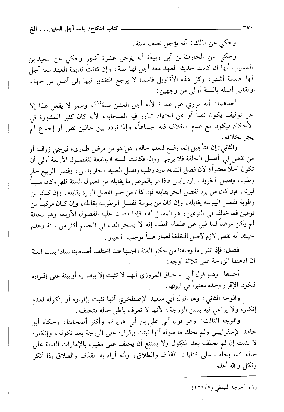 والثاني: إن التأجيل إِنَّمَا وَضِعَ لِيُعْلَمَ حَالُهُ، هَلْ هُوَ مِنْ مَرَضٍ طَارِئٍ فَيُرْجَى زَوَالُهُ أَوْ مِنْ نقصٍ فِي أَصْلِ الْخِلْقَةِ فَلَا يُرْجَى زَوَالُهُ فَكَانَتِ السَّنَةُ الْجَامِعَةُ لِلْفُصُولِ الْأَرْبَعَةِ أَوْلَى أَنْ تَكُونَ أَجَلًا مُعْتَبَرًا؛ لِأَنَّ فَصْلَ الشِّتَاءِ بَارِدٌ رَطْبٌ وَفَصْلَ الصَّيْفِ حَارٌّ يَابِسٌ، وَفَصْلَ الرَّبِيعِ حَارٌّ رَطْبٌ، وَفَصْلَ الْخَرِيفِ بَارِدٌ يَابِسٌ فَإِذَا مَرَّ بِالْمَرَضِ مَا يُقَابِلُهُ مِنْ فُصُولِ السَّنَةِ ظَهَرَ وَكَانَ سَبَبًا لِبُرْئِهِ، فَإِنْ كَانَ مِنْ بَرْدٍ ففصل الحد يقابله فإن كَانَ مِنْ حَرٍّ فَفَصْلُ الْبَرْدِ يُقَابِلُهُ، وَإِنْ كَانَ مِنْ رُطُوبَةٍ فَفَصَلُ الْيُبُوسَةِ يُقَابِلُهُ، وَإِنْ كَانَ مِنْ يُبُوسَةٍ فَفَصْلُ الرُّطُوبَةِ يُقَابِلُهُ، وَإِنْ كَانَ مُرَكَّبًا مِنْ نَوْعَيْنِ فَمَا خَالَفَهُ فِي النَّوْعَيْنِ، هُوَ الْمُقَابِلُ لَهُ، فَإِذَا مَضَتْ عَلَيْهِ الْفُصُولُ الْأَرْبَعَةُ وَهُوَ بِحَالِهِ لَمْ يَكُنْ مَرَضًا لِمَا قِيلَ عَنْ عُلَمَاءِ الطِّبِّ أَنَّهُ لَا يسحر الدَّاءُ فِي الْجِسْمِ أَكْثَرَ مِنْ سَنَةٍ وَعُلِمَ حِينَئِذٍ أَنَّهُ نَقْصٌ لَازِمٌ لِأَصْلِ الْخِلْقَةِ فَصَارَ عَيْبًا يُوجِبُ الْخِيَارَ.