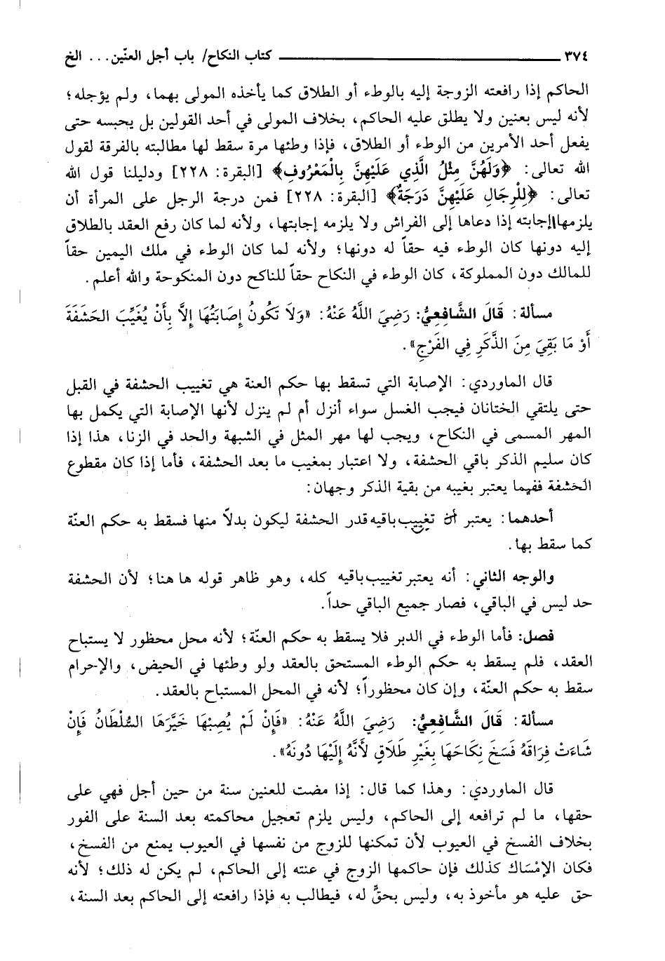 قَالَ الْمَاوَرْدِيُّ: وَهَذَا كَمَا قَالَ: إِذَا مَضَتْ لِلْعِنِّينِ سَنَةً مِنْ حِينِ أُجِّلَ فَهِيَ عَلَى حقها، ما لم ترافعه إِلَى الْحَاكِمِ، وَلَيْسَ يَلْزَمُ تَعْجِيلُ مُحَاكَمَتِهِ بَعْدَ السَّنَةِ عَلَى الْفَوْرِ بِخِلَافِ الْفَسْخِ فِي الْعُيُوبِ لأن تمكنها لِلزَّوْجِ مِنْ نَفْسِهَا فِي الْعُيُوبِ يَمْنَعُ مِنَ الفسخ، فكان الإمساك كذلك فإن حاكمها الزوج في عنته إلى الحاكم، لم يكن له ذلك، لِأَنَّهُ حَقٌّ عَلَيْهِ هُوَ مَأْخُوذٌ بِهِ، وَلَيْسَ بِحَقٍّ لَهُ، فَيُطَالِبُ بِهِ فَإِذَا رَافَعَتْهُ إِلَى الحاكم بعد السنة،