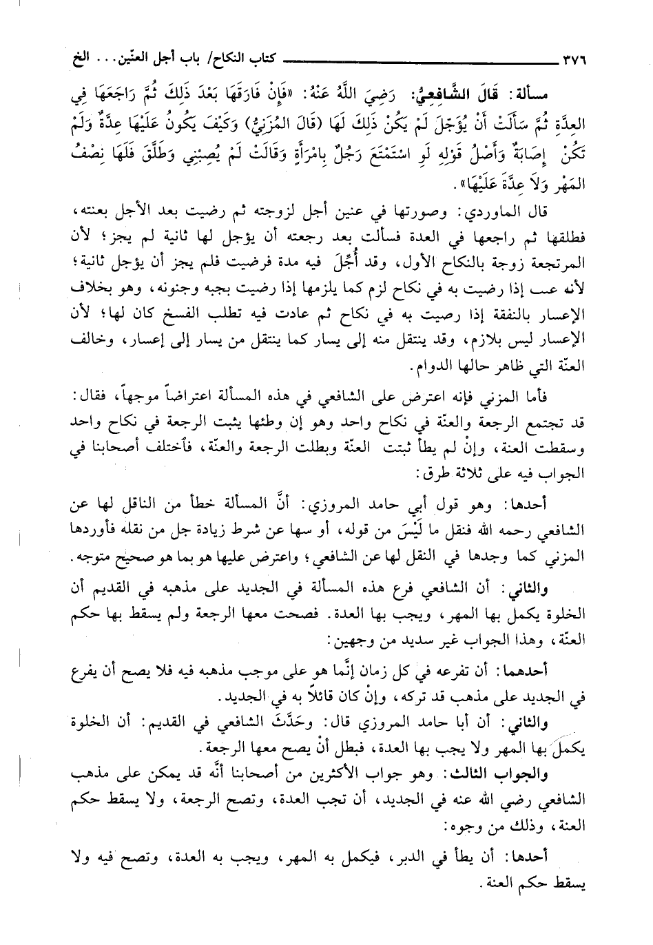 وَالْجَوَابُ الثَّالِثُ: وَهُوَ جَوَابُ الْأَكْثَرِينَ مِنْ أَصْحَابِنَا إِنَّهُ قَدْ يُمْكِنُ عَلَى مَذْهَبِ الشافعي رضي الله عنه في الجديد، أن تجب العدة، ونصح الرَّجْعَةُ، وَلَا يَسْقُطُ حَكَمُ الْعُنَّةِ، وَذَلِكَ مِنْ وُجُوهٍ: