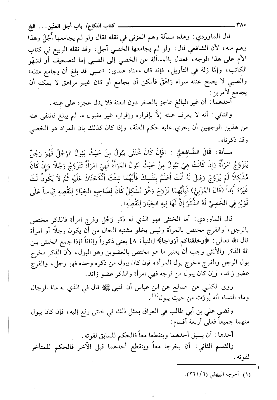 قال الماوردي: وهذه مسألة وهم المزني في نقله فقال ولو لم يجامعها أُجِّلَ وَهَذَا وَهْمٌ مِنْهُ، لِأَنَّ الشَّافِعِيَّ قَالَ: وَلَوْ لَمْ يُجَامِعْهَا الْخَصِيُّ أُجِّلَ، وَقَدْ نَقَلَهُ الرَّبِيعُ فِي كِتَابِ الْأُمِّ عَلَى هَذَا الْوَجْهِ، فَعَدَلَ بِالْمَسْأَلَةِ عَنِ الْخَصِيِّ إِلَى الصَّبِيِّ إِمَّا لتصحيف أو لسهو الكاتب، وأما زلة فِي التَّأْوِيلِ، فَإِنَّهُ قَالَ مَعْنَاهُ عِنْدِي: " صَبِيٌّ قَدْ بَلَغَ أَنْ يُجَامِعَ مِثْلُهُ " وَالصَّبِيُّ لَا يصح عُنَّتُهُ سَوَاءٌ رَاهَقَ فَأَمْكَنَ أَنْ يُجَامِعَ أَوْ كَانَ غَيْرَ مُرَاهِقٍ لَا يُمْكِنُهُ أَنْ يُجَامِعَ لِأَمْرَيْنِ: