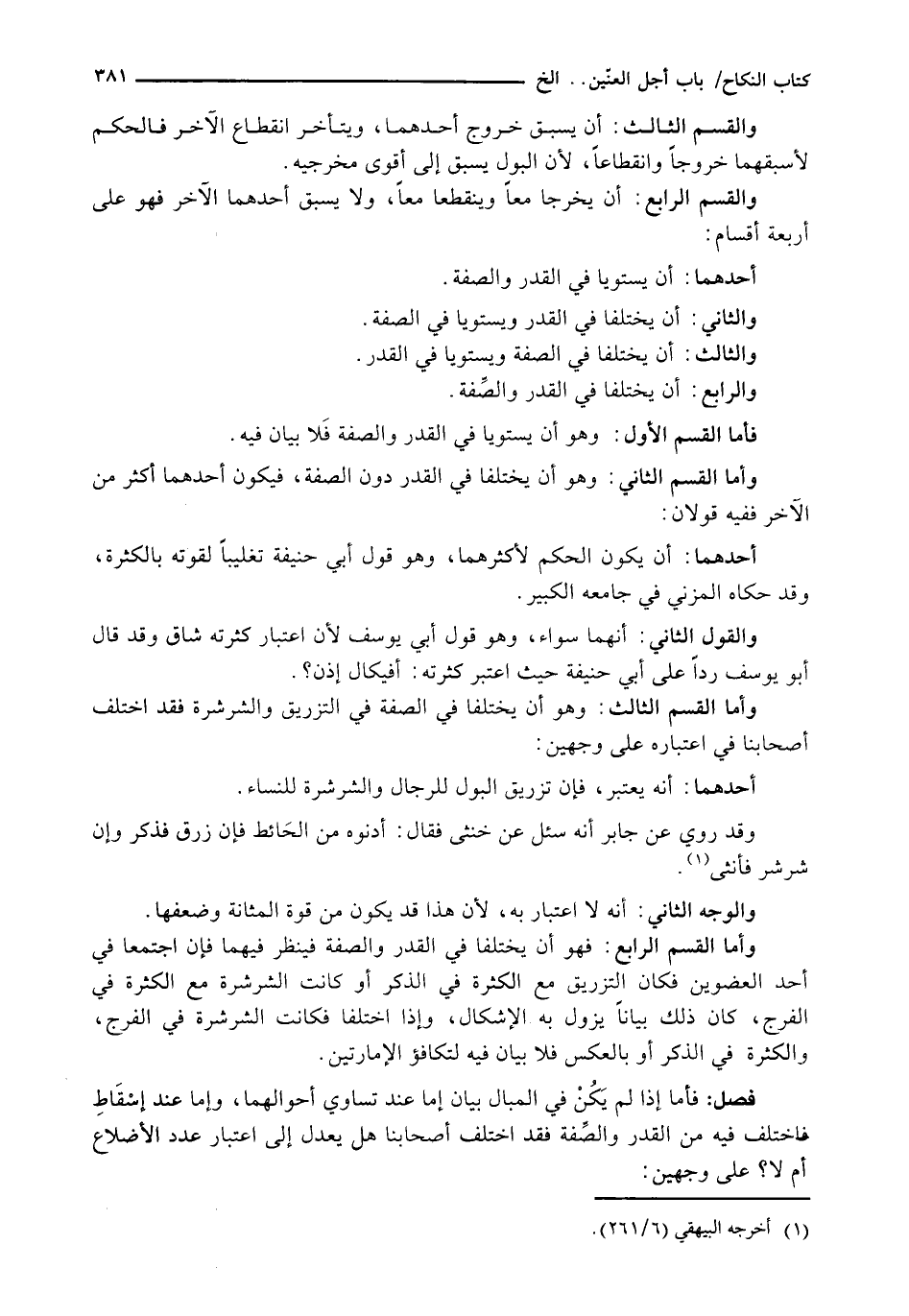 وَأَمَّا الْقِسْمُ الرَّابِعُ: فَهُوَ أَنْ يَخْتَلِفَا فِي الْقَدْرِ وَالصِّفَةِ فَيَنْظُرُ فِيهِمَا فَإِنِ اجْتَمَعَا فِي أَحَدِ الْعُضْوَيْنِ فَكَانَ التَّزْرِيقُ مَعَ الْكَثْرَةِ فِي الذَّكَرِ أَوْ كَانَتِ الشَّرْشَرَةُ مَعَ الْكَثْرَةِ فِي الْفَرْجِ، كَانَ ذَلِكَ بَيَانًا يَزُولُ بِهِ الْإِشْكَالُ، وَإِذَا اخْتَلَفَا فَكَانَتِ الشَّرْشَرَةُ فِي الْفَرْجِ، وَالْكَثْرَةُ فِي الذَّكَرِ أَوْ بِالْعَكْسِ فَلَا بَيَانَ فِيهِ لِتَكَافُؤِ الْأَمَارَتَيْنِ.