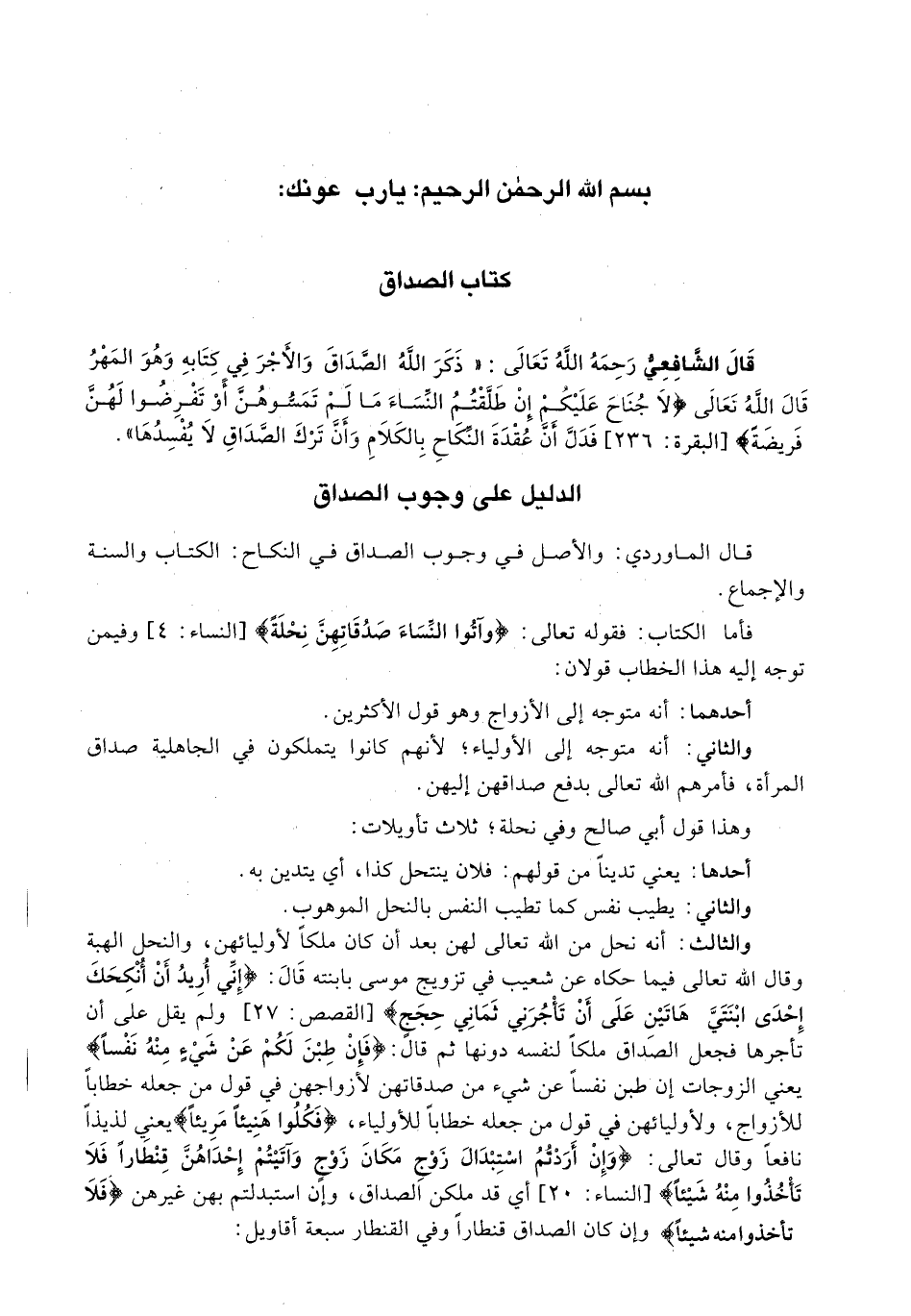 قال الشافعي رحمه الله تعالى: " ذَكَرَ اللَّهُ الصَّدَاقَ وَالْأَجْرَ فِي كِتَابِهِ وَهُوَ الْمَهْرُ قَالَ اللَّهُ تَعَالَى {لاَ جُنَاحَ عَلَيْكُمْ إِنْ طَلَّقْتُمُ النِّسَاءَ مَا لَمْ تَمَسُّوهُنَّ أوْ تَفْرِضُوا لَهُنَّ فَرِيضَة) {البقرة: 236) فَدَلَّ أَنَّ عُقْدَةَ النِّكَاحِ بِالْكَلَامِ وَأَنَّ تَرْكَ الصَّدَاقِ لَا يُفْسِدُهَا ".