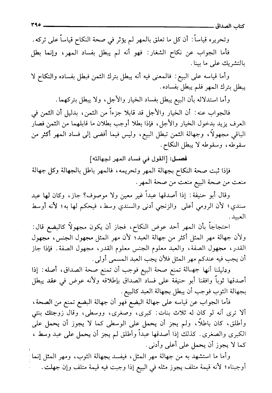 فَأَمَّا الْجَوَابُ عَنْ قِيَاسِهِ عَلَى جَهَالَةِ الْبُضْعِ فَهُوَ أَنَّ جَهَالَةَ الْبُضْعِ تَمْنَعُ مِنَ الصِّحَّةِ، أَلَا تَرَى أَنَّهُ لَوْ كَانَ لَهُ ثَلَاثُ بَنَاتٍ: كُبْرَى، وَصُغْرَى، وَوُسْطَى وَقَالَ زَوَّجْتُكَ بِنْتِي وَأَطْلَقَ، كَانَ بَاطِلًا، وَلَمْ يَجُزْ أَنْ يُحْمَلَ عَلَى الْوُسْطَى كَمَا لَا يَجُوزُ أَنْ يُحْمَلَ عَلَى الْكُبْرَى وَالصُّغْرَى. كَذَلِكَ إِذَا أَصْدَقَهَا عَبْدًا وَأَطْلَقَ لَمْ يَجُزْ أَنْ يُحْمَلَ عَلَى عَبْدٍ وَسَطٍ، كَمَا لَا يَجُوزُ أَنْ يُحْمَلَ عَلَى أَعْلَى وَأَدْنَى.