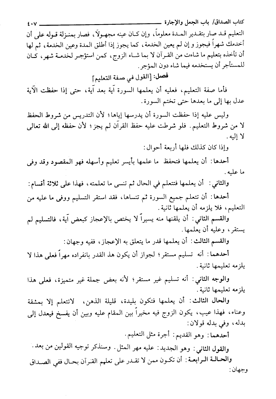 التَّعْلِيمَ قَدْ صَارَ بِتَقْدِيرِ الْمُدَّةِ مَعْلُومًا، وَإِنْ كَانَ عَيْنُهُ مَجْهُولًا، فَصَارَ بِمَنْزِلَةِ قَوْلِهِ عَلَيَّ أَنْ أَخْدِمَكَ شَهْرًا فَيَجُوزُ وَإِنْ لَمْ يُعَيِّنِ الْخِدْمَةَ، كَمَا يَجُوزُ إِذَا أَطْلَقَ الْمُدَّةَ وَعَيَّنَ الْخِدْمَةَ، ثُمَّ لَهَا أَنْ تَأْخُذَهُ بِتَعْلِيمِ مَا شَاءَتْ مِنَ الْقُرْآنِ لَا بِمَا شَاءَ الزَّوْجُ، كمن استؤجر لخدمة شهر، كان للمستأجر أن يستخدمه فِيمَا شَاءَ دُونَ الْمُؤَجَّرِ.
