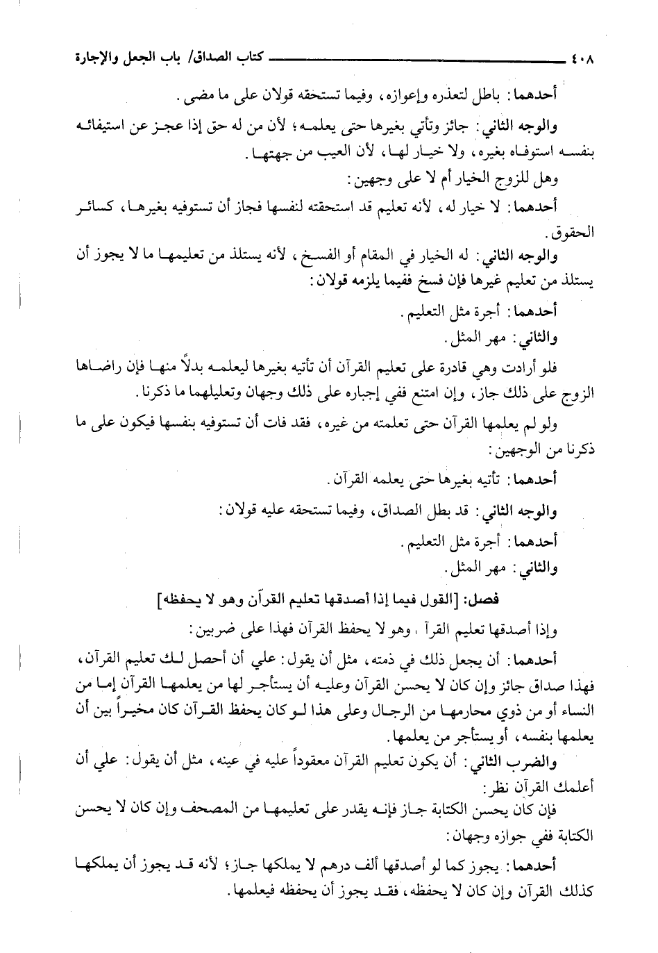 أَحَدُهُمَا: أَنْ يَجْعَلَ ذَلِكَ فِي ذِمَّتِهِ، مِثْلَ أَنْ يَقُولَ: عَلَيَّ أَنْ أُحَصِّلَ لَكِ تَعْلِيمَ الْقُرْآنِ، فَهَذَا صَدَاقٌ جَائِزٌ وَإِنْ كَانَ لَا يُحْسِنُ الْقُرْآنَ وَعَلَيْهِ أَنْ يَسْتَأْجِرَ لَهَا مَنْ يُعَلِّمُهَا الْقُرْآنَ إِمَّا مِنَ النِّسَاءِ أَوْ مِنْ ذَوِي مَحَارِمِهَا مِنَ الرِّجَالِ وَعَلَى هَذَا لَوْ كَانَ يَحْفَظُ الْقُرْآنَ كَانَ مُخَيَّرًا بَيْنَ أَنْ يُعَلِّمَهَا بِنَفْسِهِ، أَوْ يَسْتَأْجِرَ مَنْ يُعَلِّمُهَا.