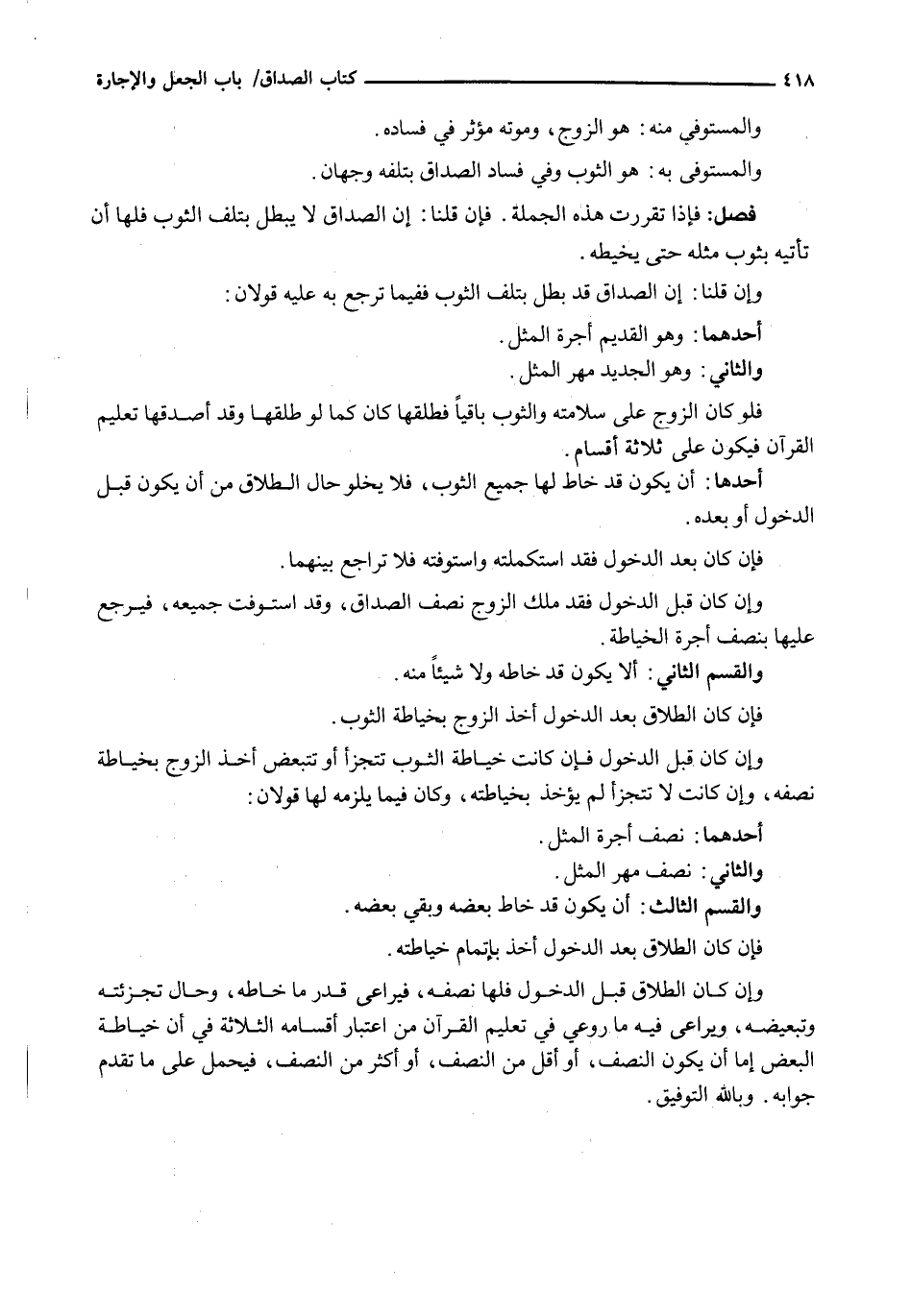 وَإِنْ كَانَ الطَّلَاقُ قَبْلَ الدُّخُولِ فَلَهَا نِصْفُهُ، فَيُرَاعَى قَدْرُ مَا خَاطَهُ، وَحَالُ تَجْزِئَتِهِ وَتَبْعِيضِهِ، وَيُرَاعَى فِيهِ مَا رُوعِيَ فِي تَعْلِيمِ الْقُرْآنِ مِنِ اعْتِبَارِ أَقْسَامِهِ الثَّلَاثَةِ فِي أَنَّ خِيَاطَةَ الْبَعْضِ إِمَّا أَنْ يَكُونَ النِّصْفَ، أَوْ أَقَلَّ مِنَ النِّصْفِ، أَوْ أَكْثَرَ مِنَ النِّصْفِ، فَيُحْمَلُ عَلَى مَا تَقَدَّمَ جَوَابُهُ. وَبِاللَّهِ التَّوْفِيقُ.