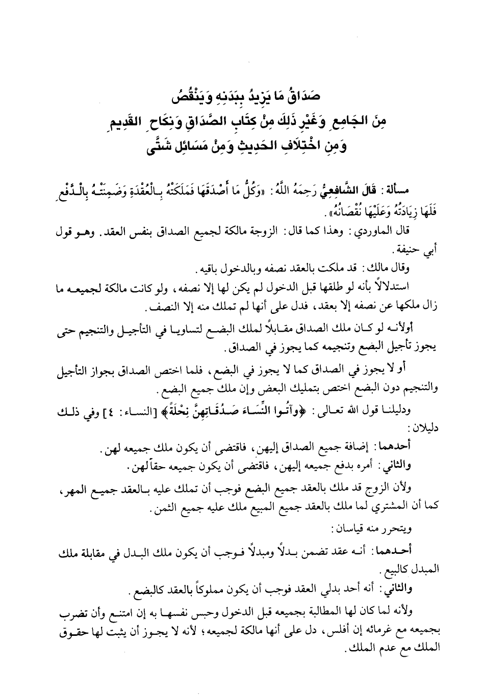 صداق ما يزيد ببدنه وينقص من الجامع وغير ذلك من كتاب الصداق ونكاح القديم ومن اختلاف الحديث ومن مسائل شتى