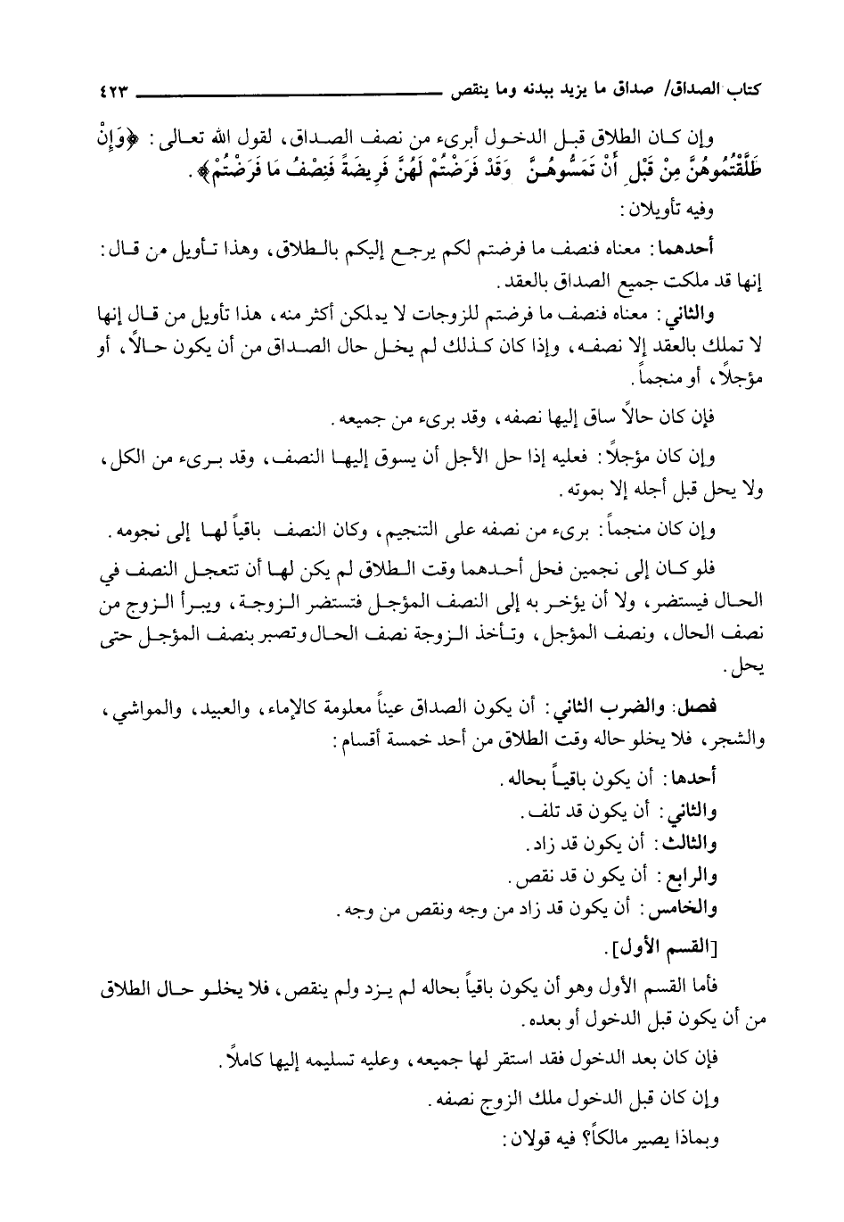 فَأَمَّا الْقِسْمُ الْأَوَّلُ وَهُوَ أَنْ يَكُونَ بَاقِيًا بِحَالِهِ لَمْ يَزِدْ وَلَمْ يَنْقُصْ، فَلَا يَخْلُو حَالُ الطَّلَاقِ مِنْ أَنْ يَكُونَ قَبْلَ الدُّخُولِ أَوْ بَعْدَهُ.