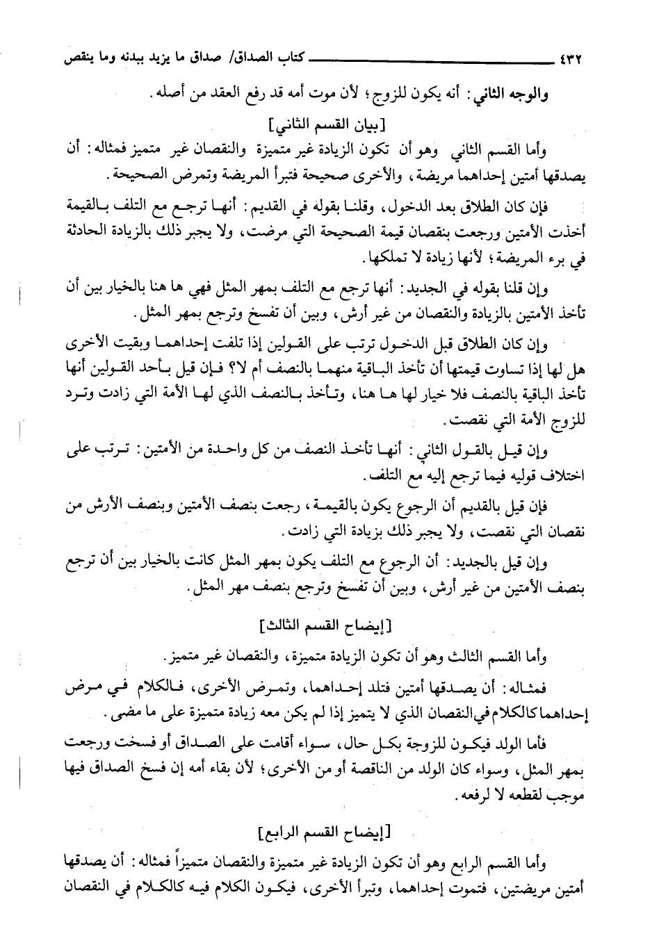 وأما القسم الرابع وهو أن تَكُونَ الزِّيَادَةُ غَيْرَ مُتَمَيِّزَةٍ وَالنُّقْصَانُ مُتَمَيِّزًا فَمِثَالُهُ: أَنْ يُصْدِقَهَا أَمَتَيْنِ مَرِيضَتَيْنِ، فَتَمُوتُ إِحْدَاهُمَا، وَتَبْرَأُ الْأُخْرَى، فَيَكُونُ الْكَلَامُ فِيهِ كَالْكَلَامِ فِي النُّقْصَانِ