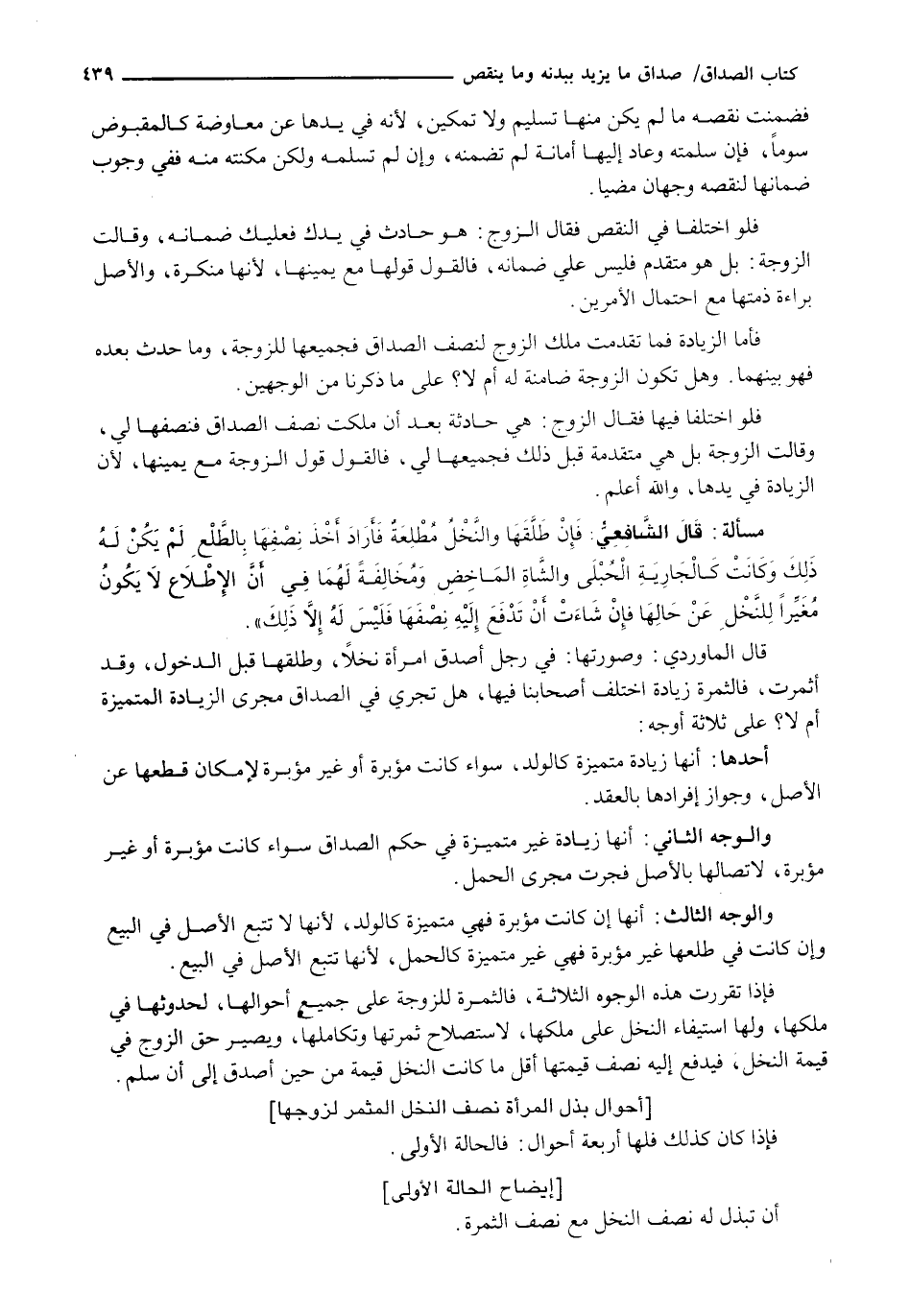 فَإِذَا تَقَرَّرَتْ هَذِهِ الْوُجُوهُ الثَّلَاثَةُ، فَالثَّمَرَةُ لِلزَّوْجَةِ عَلَى جَمِيعِ أَحْوَالِهَا، لِحُدُوثِهَا فِي مِلْكِهَا، وَلَهَا اسْتِيفَاءُ النَّخْلِ عَلَى مِلْكِهَا، لِاسْتِصْلَاحِ ثَمَرَتِهَا وَتَكَامُلِهَا، وَيَصِيرُ حَقُّ الزَّوْجِ فِي قِيمَةِ النَّخْلِ، فَيُدْفَعُ إِلَيْهِ نِصْفُ قِيمَتِهَا أَقَلَّ مَا كَانَتِ النَّخْلُ قِيمَةً مِنْ حِينِ أَصْدَقَ إِلَى أَنْ سُلِّمَ.