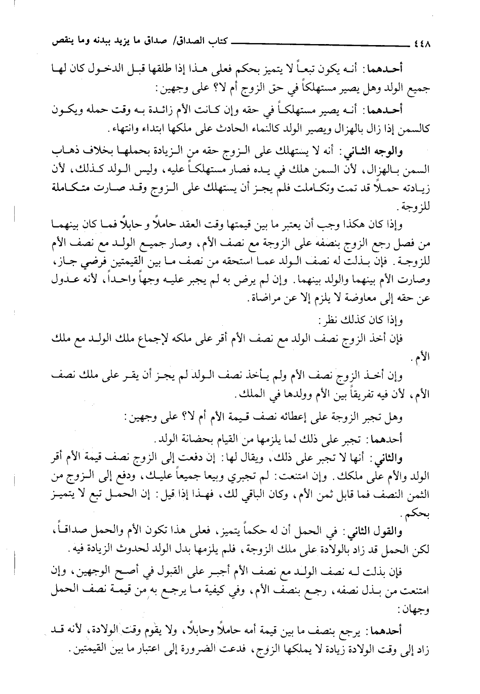 وَالْوَجْهُ الثَّانِي: أَنَّهُ لَا يُسْتَهْلَكُ عَلَى الزَّوْجِ حَقُّهُ مِنَ الزِّيَادَةِ بِحَمْلِهَا بِخِلَافِ ذَهَابِ السِمَنِ بِالْهُزَالِ، لِأَنَّ السِمَنَ هَلَكَ فِي يَدِهِ فَصَارَ مُسْتَهْلَكًا عَلَيْهِ، وَلَيْسَ الْوَلَدُ كَذَلِكَ، لِأَنَّ زِيَادَتَهُ حَمْلًا قَدْ تَمَّتْ وَتَكَامَلَتْ فَلَمْ يَجُزْ أَنْ يُسْتَهْلَكَ عَلَى الزَّوْجِ وَقَدْ صَارَتْ مُتَكَامِلَةً لِلزَّوْجَةِ.