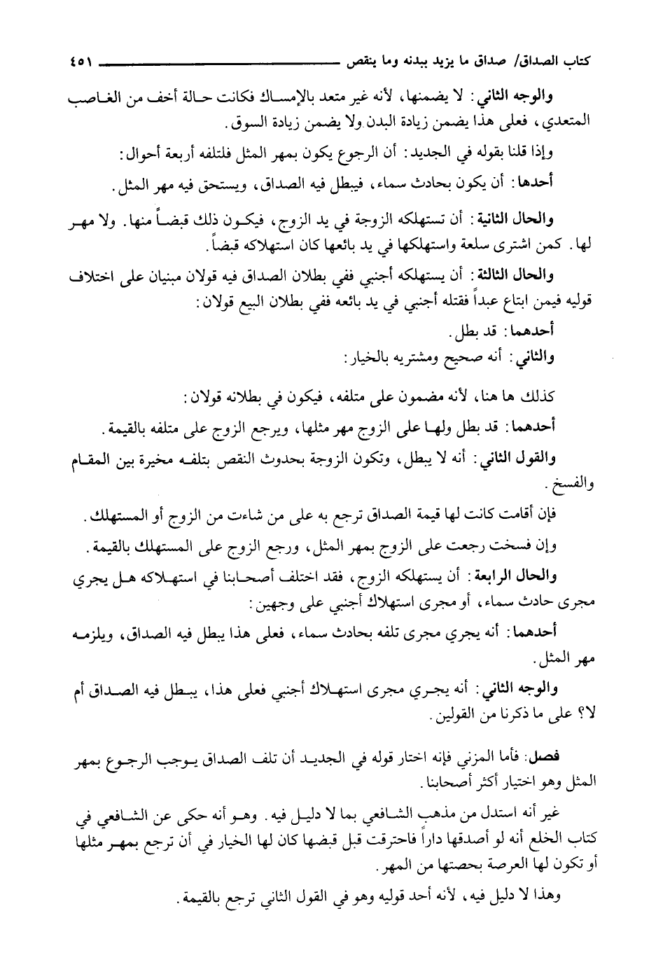 فَأَمَّا الْمُزَنِيُّ فَإِنَّهُ اخْتَارَ قَوْلَهُ فِي الْجَدِيدِ أَنَّ تَلَفَ الصَّدَاقِ يوجب الرجوع بمهر المثل وهو اختيار أَكْثَرِ أَصْحَابِنَا.