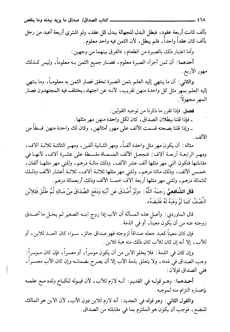 وَالْقَوْلُ الثَّانِي: وَهُوَ قَوْلُهُ فِي الْجَدِيدِ: أَنَّهُ لَازِمٌ لِلِابْنِ دُونَ الْأَبِ، لِأَنَّ الِابْنَ هُوَ الْمَالِكُ لِلْبُضْعِ، فَوَجَبَ أَنْ يَكُونَ هُوَ الْمُلْتَزِمَ بِمَا فِي مُقَابَلَتِهِ مِنَ الصَّدَاقِ.