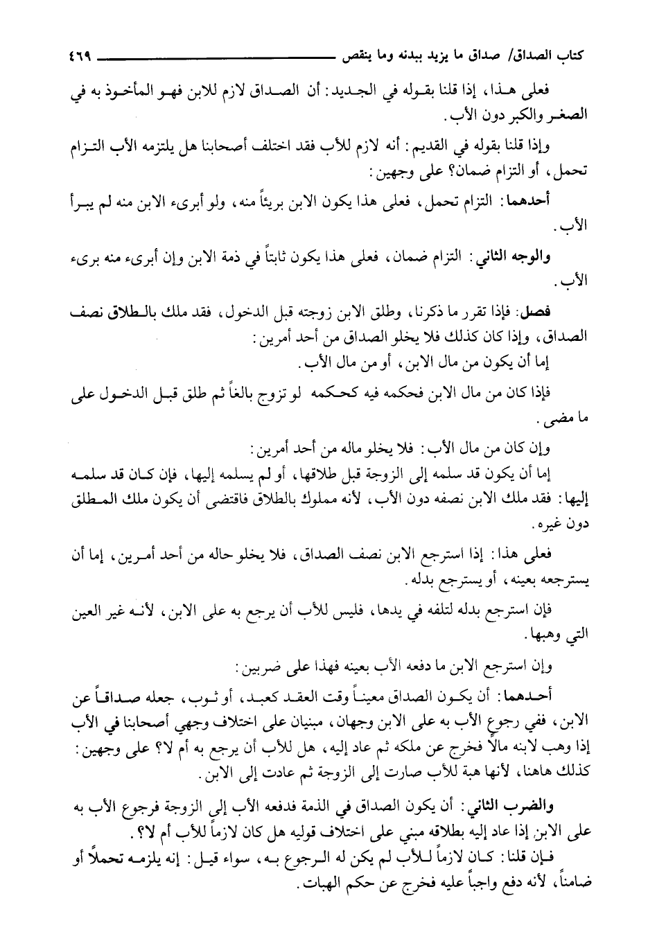 وَالضَّرْبُ الثاني: أن يكون الصداق فِي الذِّمَّةِ فَدَفَعَهُ الْأَبُ إِلَى الزَّوْجَةِ فَرُجُوعُ الْأَبِ بِهِ عَلَى الِابْنِ إِذَا عَادَ إِلَيْهِ بِطَلَاقِهِ مَبْنِيٌّ عَلَى اخْتِلَافِ قَوْلَيْهِ هَلْ كَانَ لَازِمًا لِلْأَبِ أَمْ لَا؟
