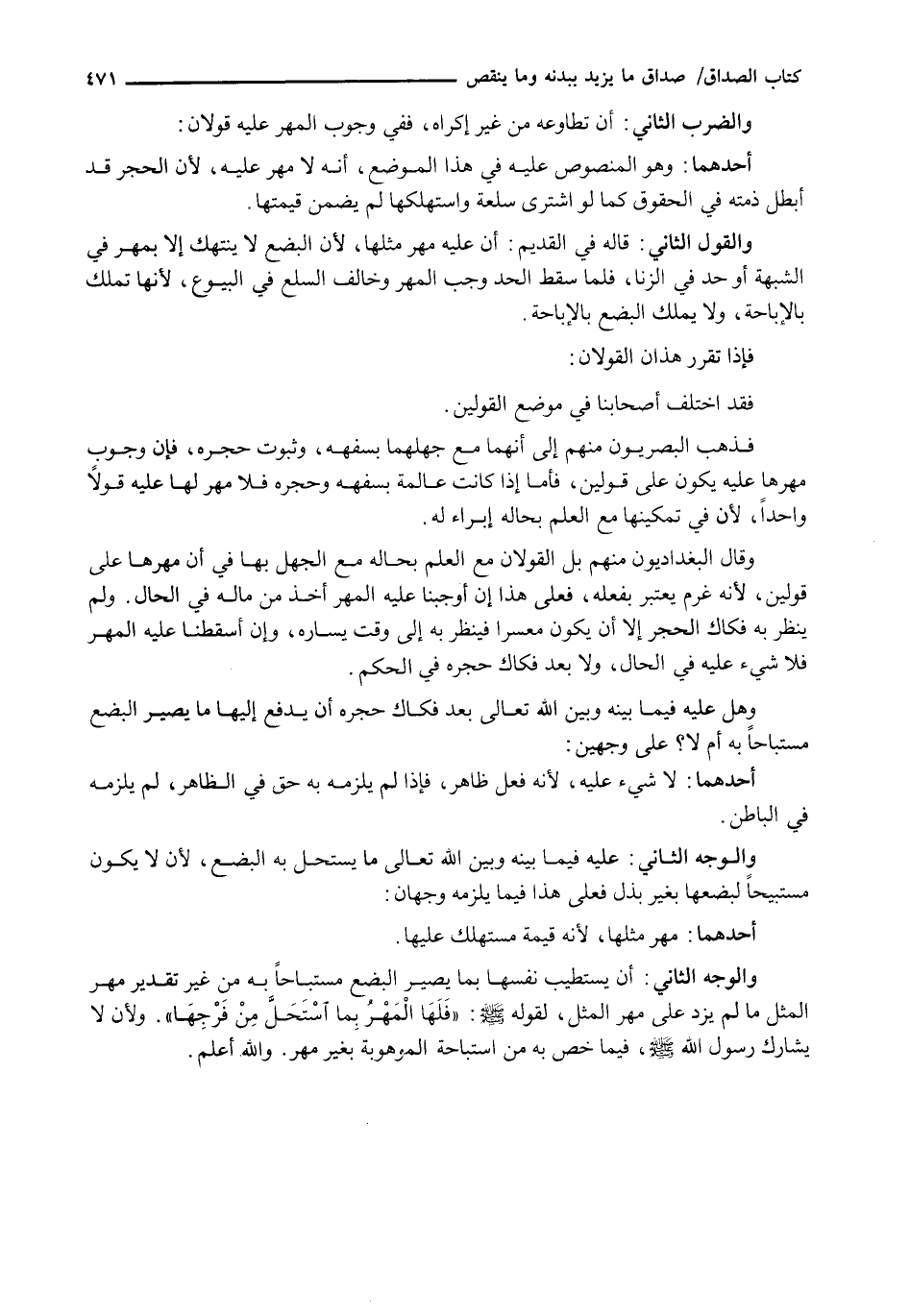 وَقَالَ الْبَغْدَادِيُّونَ مِنْهُمْ بَلِ الْقَوْلَانِ مَعَ الْعِلْمِ بِحَالِهِ مَعَ الْجَهْلِ بِهَا فِي أَنَّ مَهْرَهَا عَلَى قَوْلَيْنِ، لِأَنَّهُ غُرْمٌ يعتبر بفعله، فَعَلَى هَذَا إِنْ أَوْجَبْنَا عَلَيْهِ الْمَهْرَ أُخِذَ مِنْ مَالِهِ فِي الْحَالِ. وَلَمْ يُنْظَرْ بِهِ فِكَاكُ الْحَجْرِ إِلَّا أَنْ يَكُونَ مُعْسِرًا فَيُنْظَرُ به على وَقْتِ يَسَارِهِ، وَإِنْ أَسْقَطْنَا عَلَيْهِ الْمَهْرَ فَلَا شَيْءَ عَلَيْهِ فِي الْحَالِ، وَلَا بَعْدَ فِكَاكِ حَجْرِهِ فِي الْحُكْمِ.