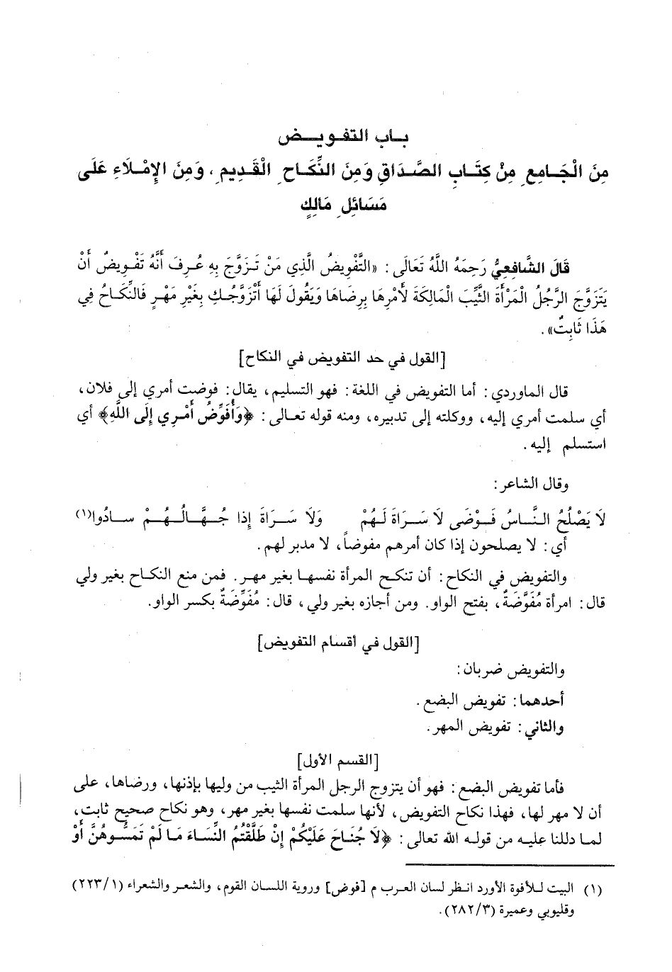 باب التفويض من الجامع من كتاب الصداق ومن النكاح القديم، ومن الإملاء على مسائل مالكٍ