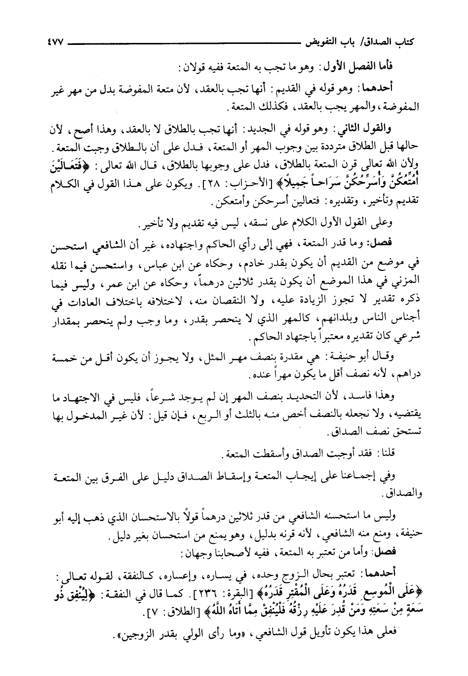وَالْقَوْلُ الثَّانِي: وَهُوَ قَوْلُهُ فِي الْجَدِيدِ: إِنَّهَا تَجِبُ بِالطَّلَاقِ لَا بِالْعَقْدِ، وَهَذَا أَصَحُّ، لِأَنَّ حَالَهَا قَبْلَ الطَّلَاقِ مُتَرَدِّدَةٌ بَيْنَ وُجُوبِ الْمَهْرِ أَوِ الْمُتْعَةِ، فَدَلَّ عَلَى أَنَّ بِالطَّلَاقِ وَجَبَتِ الْمُتْعَةُ. وَلِأَنَّ اللَّهَ تَعَالَى قَرَنَ الْمُتْعَةَ بِالطَّلَاقِ، فَدَلَّ عَلَى وُجُوبِهَا بِالطَّلَاقِ، قَالَ اللَّهُ تَعَالَى: {فَتَعَالَيْنَ أُمَتِّعُكُنَّ وَأُسَرِّحُكُنَّ سَرَاحاً جَمِيلاً) {الأحزاب: 28) . وَيَكُونُ عَلَى هَذَا الْقَوْلِ فِي الْكَلَامِ تَقْدِيمٌ وَتَأْخِيرٌ، وَتَقْدِيرُهُ: فَتَعَالَيْنَ أُسَرِّحْكُنَّ وَأُمَتِّعْكُنَّ.