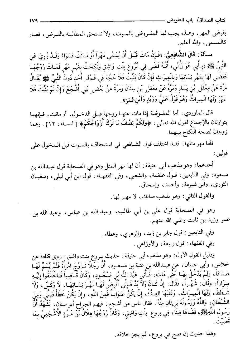 وَدَلِيلُ الْقَوْلِ الْأَوَّلِ: وَهُوَ مَذْهَبُ أَبِي حَنِيفَةَ: حَدِيثُ بَرْوَعَ بِنْتِ وَاشِقٍ: رَوَى قَتَادَةُ عَنْ خِلَاسٍ، وَأَبِي حَسَّانَ، عَنْ عَبْدِ اللَّهِ بْنِ عُتْبَةَ بْنِ مَسْعُودٍ، أَنَّ رَجُلًا تَزَوَّجَ امْرَأَةً فَلَمْ يُسَمِّ لَهَا صَدَاقًا، وَلَمْ يَدْخُلْ بِهَا حَتَّى مَاتَ، فَأَتَى عَبْدَ اللَّهِ بْنَ مَسْعُودٍ، وَكَانَ قَاضِيًا فَاخْتَلَفُوا إِلَيْهِ مِرَارًا، وَقَالَ: شَهْرًا، فَقَالَ: إِنْ كَانَ وَلَا بُدَّ فَإِنِّي أَفْرِضُ لَهَا مَهْرَ نِسَائِهَا، لَا وكسٌ، وَلَا شططٌ، وَلَهَا الْمِيرَاثُ، وَعَلَيْهَا الْعِدَّةُ، إِنْ يَكُنْ صَوَابًا فَمِنَ اللَّهِ، وَإِنْ يَكُنْ خَطَأً فَمِنِّي وَمِنَ الشَّيْطَانِ، وَاللَّهُ وَرَسُولُهُ بَرِيئَانِ مِنْهُ. فَقَالَ نَاسٌ مِنْ أَشْجَعَ: فِيهِمُ الْجَرَّاحُ أَبُو سِنَانٍ، نَشْهَدُ أَنَّ رَسُولَ اللَّهِ - صَلَّى اللَّهُ عَلَيْهِ وَسَلَّم َ -، قَضَاهَا فِينَا، فِي بَرْوَعَ بِنْتٍ واشقٍ، وَكَانَ زَوْجُهَا هِلَالَ بْنَ مرةٍ الْأَشْجَعِيَّ بِمَا قَضَيْتَ.
