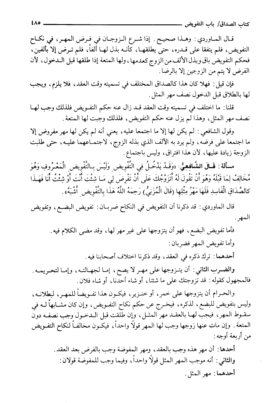 وَالْحَرَامُ أَنْ يَتَزَوَّجَهَا عَلَى خَمْرٍ، أَوْ خِنْزِيرٍ، فَيَكُونُ هَذَا تَفْوِيضًا لِلْمَهْرِ، لِبُطْلَانِهِ، وَلَيْسَ بِتَفْوِيضٍ لِلْبُضْعِ، لِذِكْرِهِ، فَيَخْرُجُ عَنْ حُكْمِ نِكَاحِ التَّفْوِيضِ، وَإِنْ كَانَ مُشَابِهًا لَهُ فِي سُقُوطِ الْمَهْرِ، فَيَجِبُ لَهَا بِالْعَقْدِ مَهْرُ الْمِثْلِ، وَإِنْ طُلِّقَتْ قَبْلَ الدُّخُولِ وَجَبَ نِصْفُهُ دُونَ الْمُتْعَةِ. وَإِنْ مَاتَ عَنْهَا زَوْجُهَا وَجَبَ لَهَا الْمَهْرُ قَوْلًا وَاحِدًا، فَيَكُونُ مُخَالِفًا لِنِكَاحِ التَّفْوِيضِ مِنْ أَرْبَعَةِ أَوْجُهٍ: