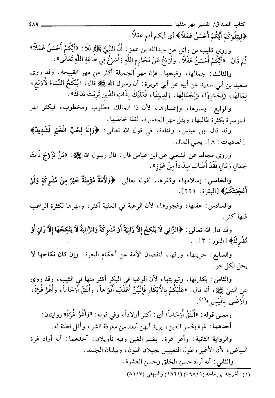 وَالثَّالِثُ: جَمَالُهَا، وَقُبْحُهَا. فَإِنَّ مَهْرَ الْجَمِيلَةِ أَكْثَرُ مِنْ مَهْرِ الْقَبِيحَةِ. وَقَدْ رَوَى سَعِيدِ بْنِ أَبِي سَعِيدٍ عَنْ أَبِيهِ عَنْ أَبِي هُرَيْرَةَ: أَنَّ رَسُولَ اللَّهِ - صَلَّى اللَّهُ عَلَيْهِ وَسَلَّم َ - قَالَ: " يُنكح النِّسَاءُ لأربعٍ، لِمَالِهَا، وَلِحَسَبِهَا، وَلِجَمَالِهَا، وَلِدِينِهَا، فَعَلَيْكَ بِذَاتِ الدِّينِ تَرِبَتْ يَدَاكَ ".