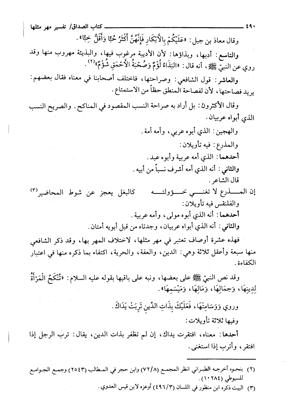 وَالْعَاشِرُ: قَوْلُ الشَّافِعِيِّ: وَصَرَاحَتُهَا، فَاخْتَلَفَ أَصْحَابُنَا فِي مَعْنَاهُ فَقَالَ بَعْضُهُمْ: يُرِيدُ فَصَاحَتَهَا، لِأَنَّ لِفَصَاحَةِ الْمَنْطِقِ حَظًّا مِنَ الِاسْتِمْتَاعِ.