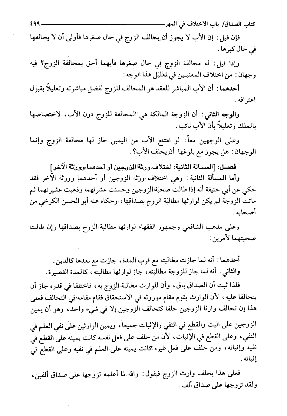 فَلِذَا ثَبَتَ أَنَّ الصَّدَاقَ بَاقٍ، وَأَنَّ لِلْوَارِثِ مُطَالَبَةَ الزَّوْجِ بِهِ، فَاخْتَلَفَا فِي قَدْرِهِ جَازَ أَنْ يَتَحَالَفَا عَلَيْهِ، لِأَنَّ الْوَارِثَ يَقُومُ مَقَامَ مَوْرُوثِهِ فِي الِاسْتِحْقَاقِ فَقَامَ مَقَامَهُ فِي التَّحَالُفِ فَعَلَى هَذَا إِنْ تَحَالَفَ وَارِثَا الزَّوْجَيْنِ حَلِفَا كَتَحَالُفِ الزَّوْجَيْنِ إِلَّا فِي شَيْءٍ وَاحِدٍ، وَهُوَ أَنَّ يَمِينَ الزَّوْجَيْنِ عَلَى الْبَتِّ وَالْقَطْعِ فِي النَّفْيِ وَالْإِثْبَاتِ جَمِيعًا، وَيَمِينَ الْوَارِثِينَ عَلَى نَفْيِ الْعِلْمِ فِي النَّفْيِ، وَعَلَى الْقَطْعِ فِي الْإِثْبَاتِ، لِأَنَّ مَنْ حَلَفَ عَلَى فِعْلِ نَفْسِهِ كَانَتْ يَمِينُهُ عَلَى الْقَطْعِ فِي نَفْيِهِ وَإِثْبَاتِهِ، وَمَنْ حَلَفَ عَلَى فِعْلِ غَيْرِهِ كَانَتْ يَمِينُهُ عَلَى الْعِلْمِ فِي نَفْيِهِ وَعَلَى الْقَطْعِ فِي إِثْبَاتِهِ.