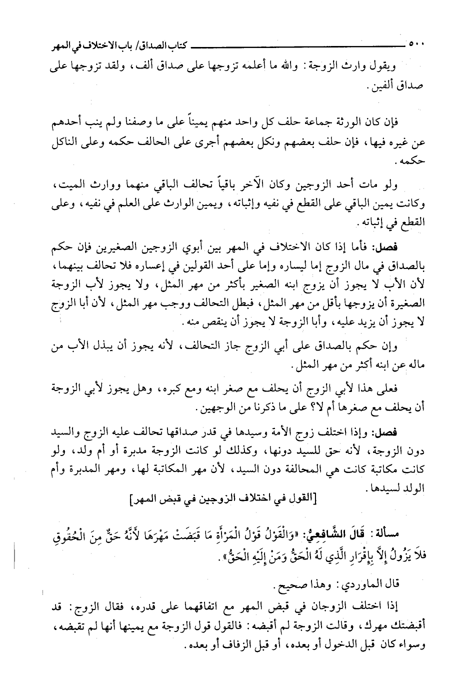 قَالَ الشافعي: " وَالْقَوْلُ قَوْلُ الْمَرْأَةِ مَا قَبَضَتْ مَهْرَهَا لِأَنَّهُ حقٌّ مِنَ الْحُقُوقِ فَلَا يَزُولُ إِلَّا بِإِقْرَارِ الَّذِي لَهُ الْحَقُّ وَمَنْ إِلَيْهِ الْحَقُّ ".