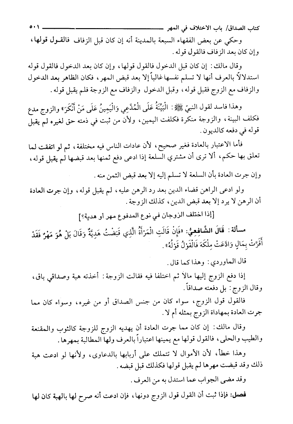 وَقَالَ مَالِكٌ: إِنْ كَانَ قَبْلَ الدُّخُولِ فَالْقَوْلُ قَوْلُهَا، وَإِنْ كَانَ بَعْدَ الدُّخُولِ فَالْقَوْلُ قَوْلُهُ اسْتِدْلَالًا بِالْعُرْفِ أَنَّهَا لَا تُسَلِّمُ نَفْسَهَا غَالِبًا إِلَّا بَعْدَ قَبْضِ الْمَهْرِ، فَكَانَ الظَّاهِرُ بَعْدَ الدُّخُولِ وَالزِّفَافِ مَعَ الزَّوْجِ فَقُبِلَ قَوْلُهُ، وَقَبْلَ الدُّخُولِ وَالزِّفَافِ مَعَ الزَّوْجَةِ فَلَمْ يُقْبَلْ قَوْلُهُ.