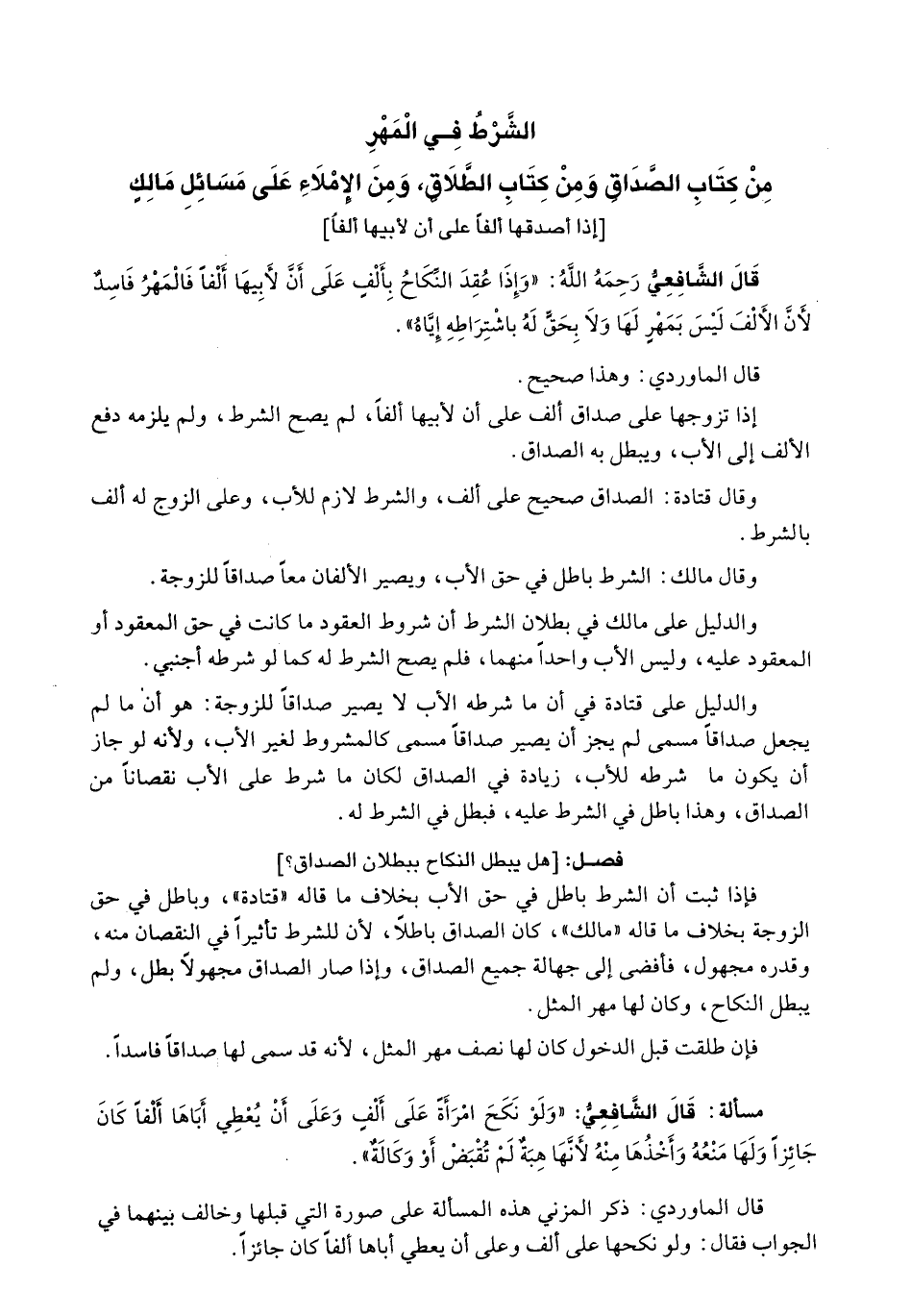 الشرط في المهر من كتاب الصداق ومن كتاب الطلاق، ومن الإملاء على مسائل مالكٍ