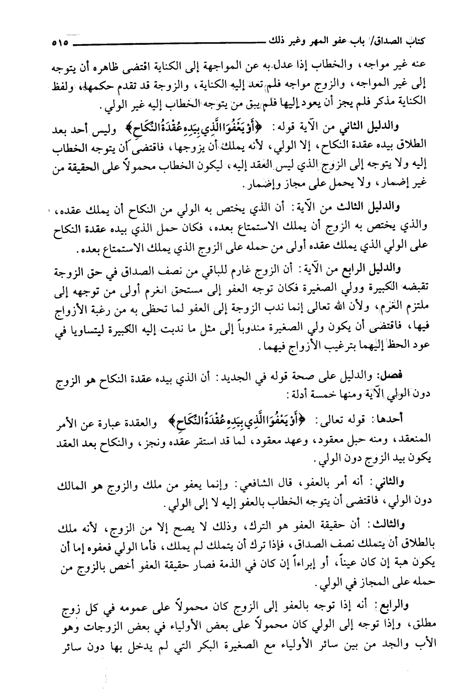 وَالدَّلِيلُ عَلَى صِحَّةِ قَوْلِهِ فِي الْجَدِيدِ: أَنَّ الَّذِي بِيَدِهِ عُقْدَةُ النِّكَاحِ هُوَ الزَّوْجُ دُونَ الْوَلِيِّ الْآيَةُ وَمِنْهَا خَمْسَةُ أَدِلَّةٍ: