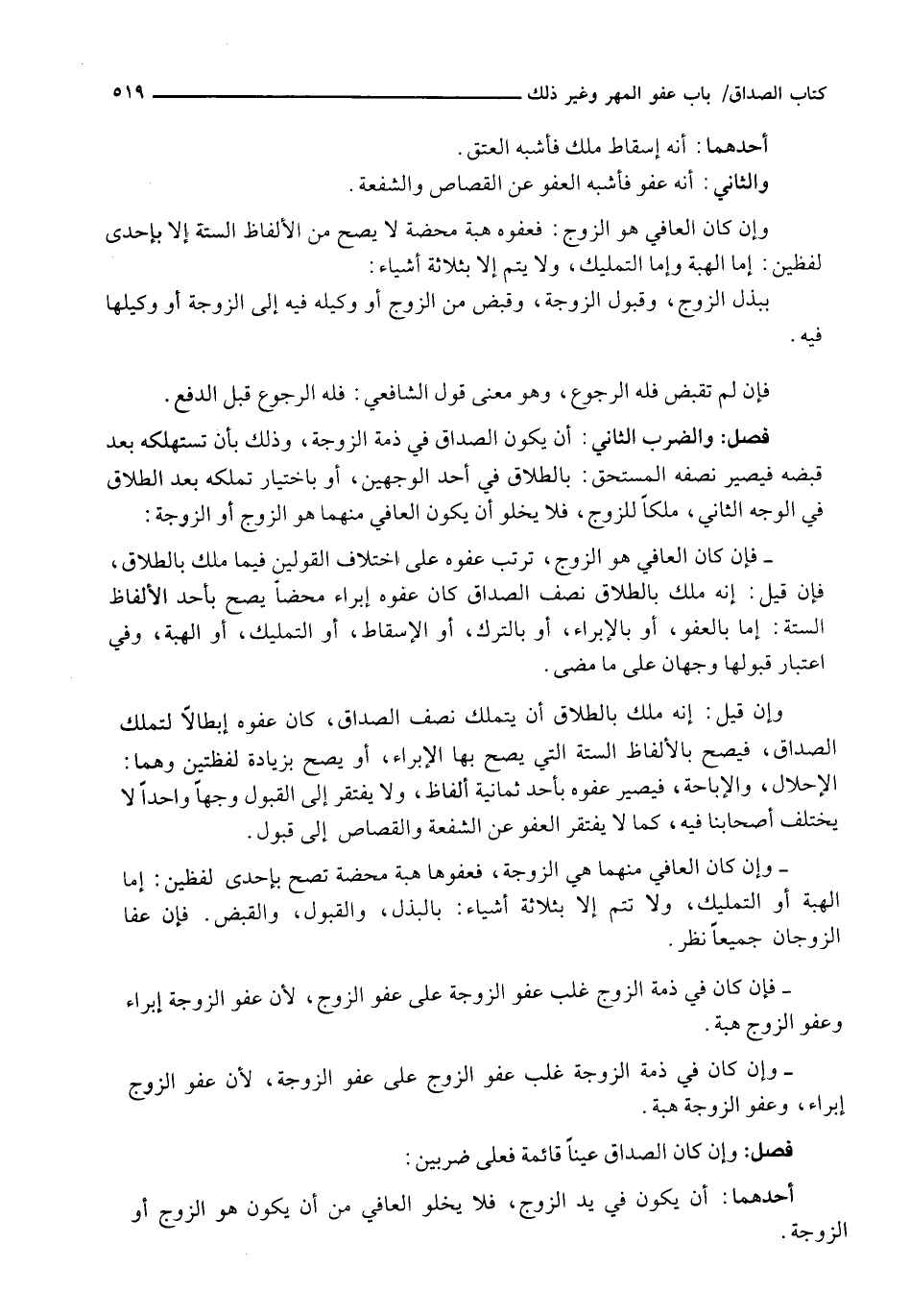 وَإِنْ كَانَ الْعَافِي هُوَ الزَّوْجَ: فَعَفْوُهُ هِبَةٌ مَحْضَةٌ لَا يَصِحُّ مِنَ الْأَلْفَاظِ السِّتَّةِ إِلَّا بِإِحْدَى لَفْظَيْنِ: إِمَّا الْهِبَةِ وَإِمَّا التَّمْلِيكِ، وَلَا يَتِمُّ إِلَّا بِثَلَاثَةِ أَشْيَاءَ: