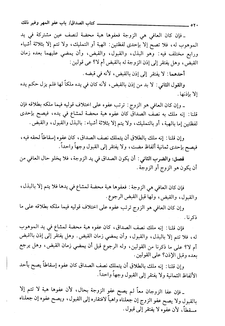 - فَإِنْ كَانَ الْعَافِي هِيَ الزَّوْجَةَ فَعَفْوُهَا هِبَةٌ مَحْضَةٌ لِنِصْفِ عَيْنٍ مُشْتَرَكَةٍ فِي يَدِ الْمَوْهُوبِ لَهُ، فَلَا تَصِحُّ إِلَّا بِإِحْدَى لَفْظَتَيْنِ: الْهِبَةِ أَوِ التَّمْلِيكِ، وَلَا تَتِمُّ إِلَّا بِثَلَاثَةِ أَشْيَاءَ وَرَابِعٍ مُخْتَلَفٍ فِيهِ وَهُوَ الْبَذْلُ، وَالْقَبُولُ، وَالْقَبْضُ، وَأَنْ يَمْضِيَ عَلَيْهِمَا بَعْدَهُ زَمَانُ الْقَبْضِ، وَهَلْ يَفْتَقِرُ إِلَى إِذْنِ الزَّوْجَةِ لَهُ بِالْقَبْضِ أَمْ لَا؟ عَلَى قَوْلَيْنِ: