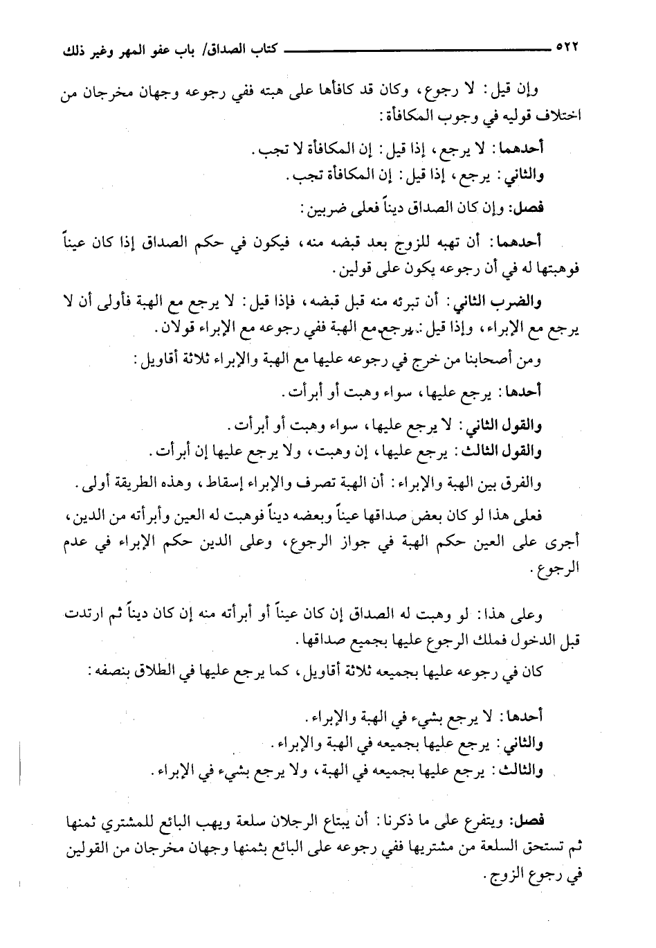 وَمِنْ أَصْحَابِنَا مَنْ خَرَّجَ فِي رُجُوعِهِ عَلَيْهَا مَعَ الْهِبَةِ وَالْإِبْرَاءِ ثَلَاثَةَ أَقَاوِيلَ: