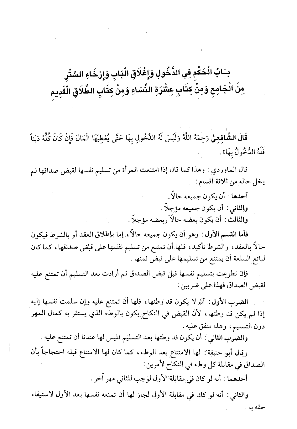 قَالَ الْمَاوَرْدِيُّ: وَهَذَا كَمَا قَالَ إِذَا امْتَنَعَتِ الْمَرْأَةُ مِنْ تَسْلِيمِ نَفْسِهَا لِقَبْضِ صَدَاقِهَا لَمْ يَخْلُ حَالُهُ مِنْ ثَلَاثَةِ أَقْسَامٍ: