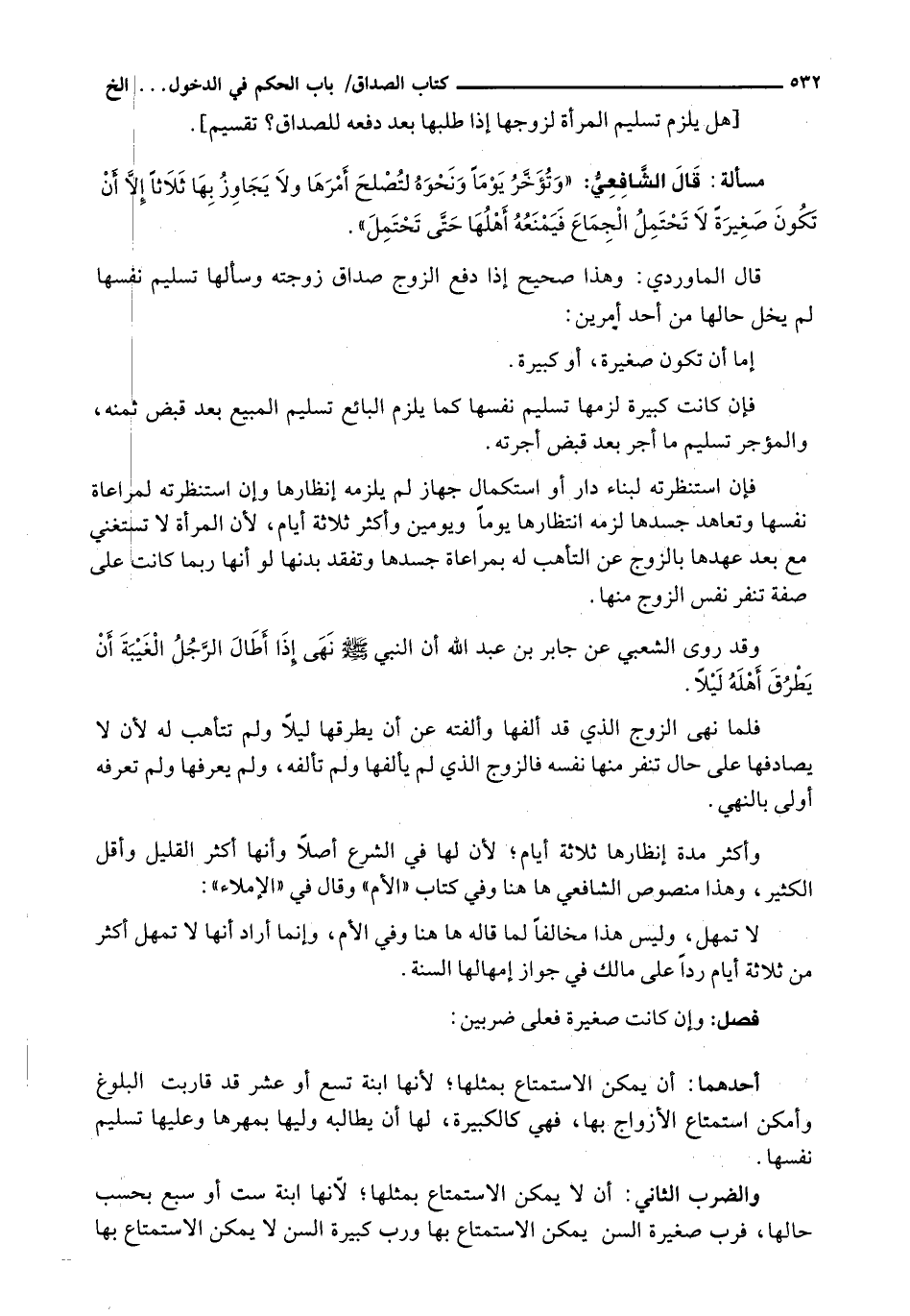 قال الشافعي: " وَتُؤَخَّرُ يَوْمًا وَنَحْوَهُ لِتُصْلِحَ أَمْرَهَا وَلَا يَجَاوِزُ بِهَا ثَلَاثًا إِلَّا أَنْ تَكُونَ صَغِيرَةً لَا تَحْتَمِلُ الْجِمَاعَ فَيَمْنَعُهُ أَهْلُهَا حَتَّى تَحْتَمِلَ ".