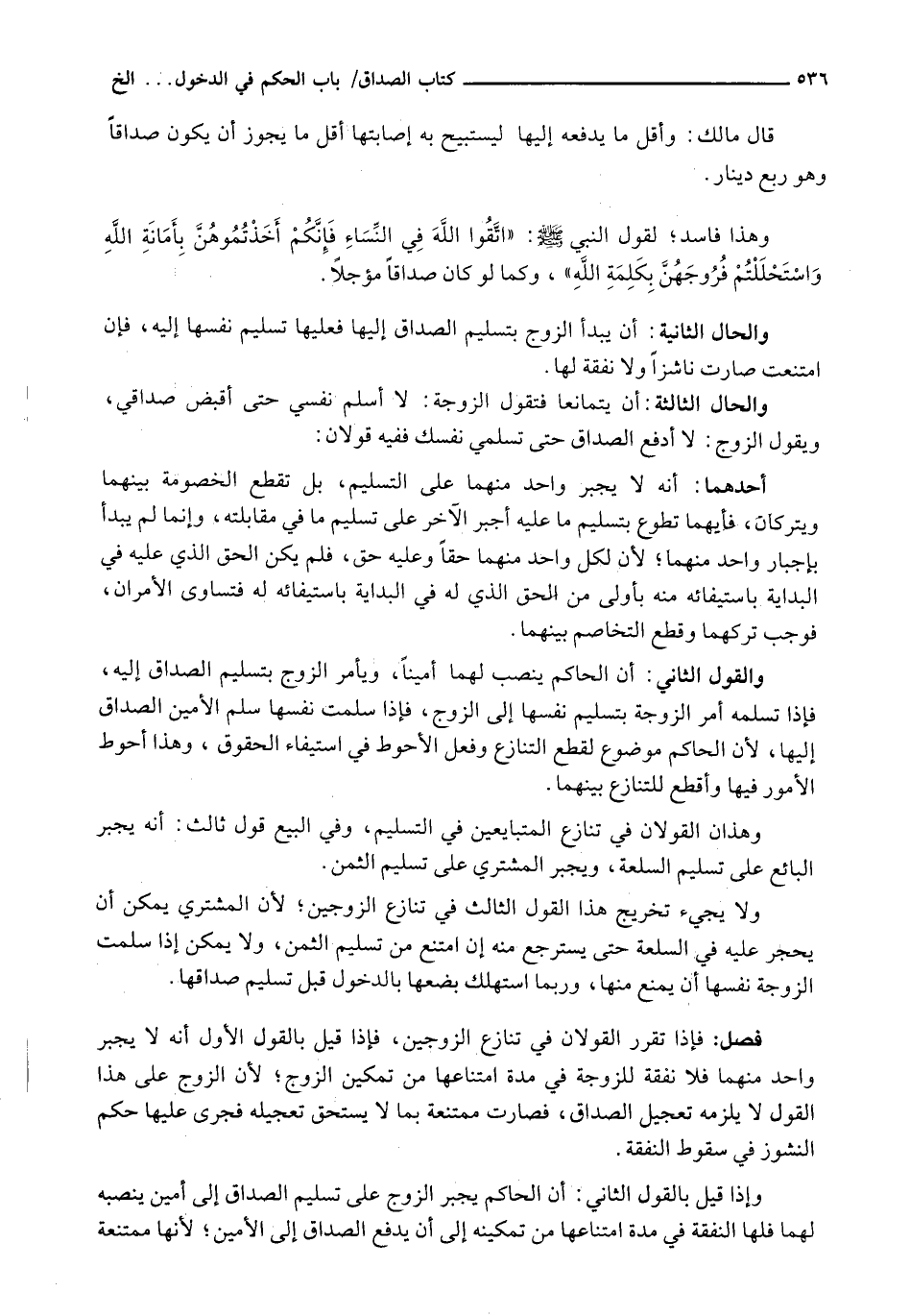 وَالْقَوْلُ الثَّانِي: أَنَّ الْحَاكِمَ يُنَصِّبُ لَهُمَا أَمِينًا، وَيَأْمُرُ الزَّوْجَ بِتَسْلِيمِ الصَّدَاقِ إِلَيْهِ، فَإِذَا تَسَلَّمَهُ أَمَرَ الزَّوْجَةَ بِتَسْلِيمِ نَفْسِهَا إِلَى الزَّوْجِ، فَإِذَا سَلَّمَتْ نَفْسَهَا سَلَّمَ الْأَمِينُ الصَّدَاقَ إِلَيْهَا، لِأَنَّ الْحَاكِمَ مَوْضُوعٌ لِقَطْعِ التَّنَازُعِ وَفِعْلِ الْأَحْوَطِ فِي اسْتِيفَاءِ الْحُقُوقِ، وَهَذَا أَحْوَطُ الْأُمُورِ فِيهَا وَأَقْطَعُ لِلتَّنَازُعِ بَيْنَهُمَا.