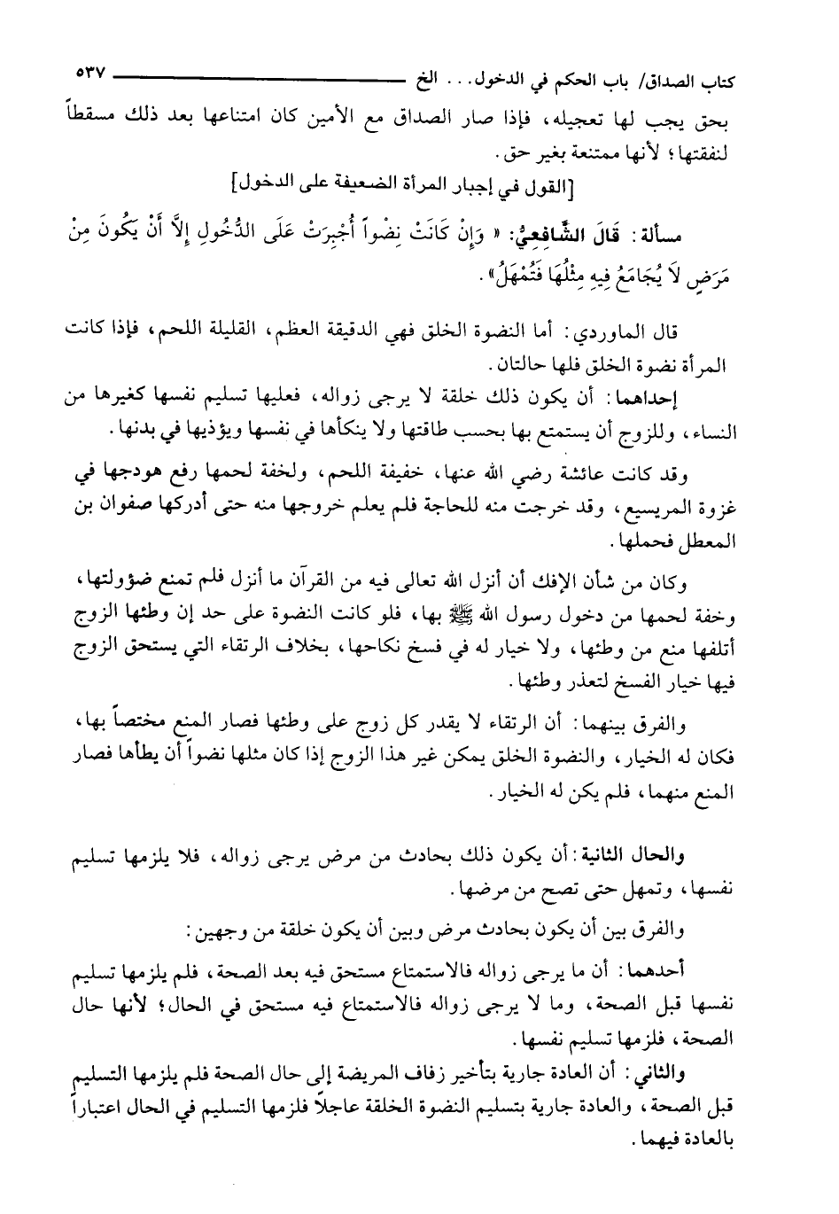 قال الشافعي: " وَإِنْ كَانَتْ نِضْوًا أُجْبِرَتْ عَلَى الدُّخُولِ إِلَّا أَنْ يَكُونَ مِنْ مرضٍ لَا يُجَامَعُ فِيهِ مِثْلُهَا فَتُمْهَلُ ".
